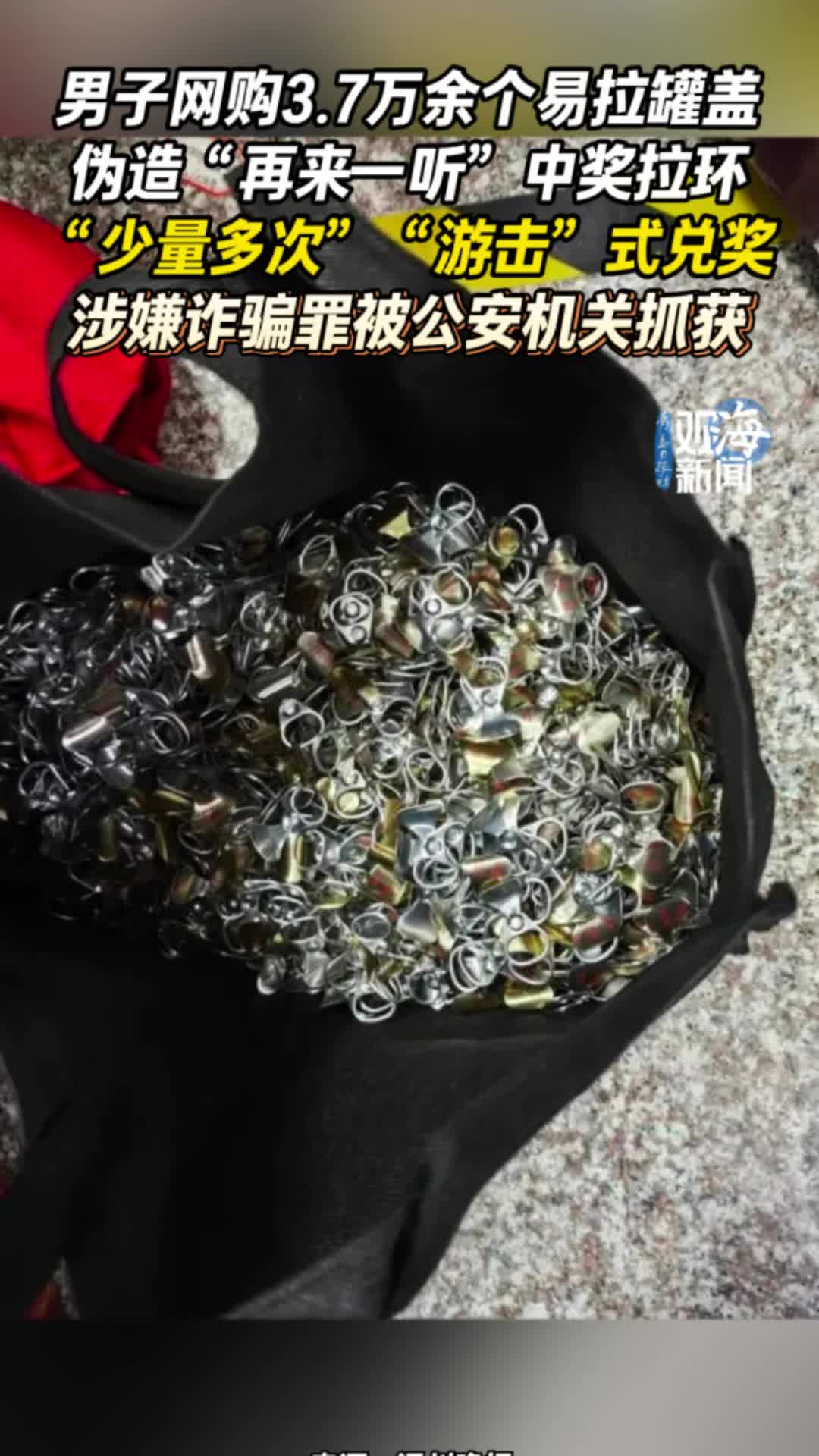 男子网购3.7万余个易拉罐盖,伪造“再来一听”中奖拉环,“少量多次”“游击”式兑奖,涉嫌诈骗罪被公安机关抓获