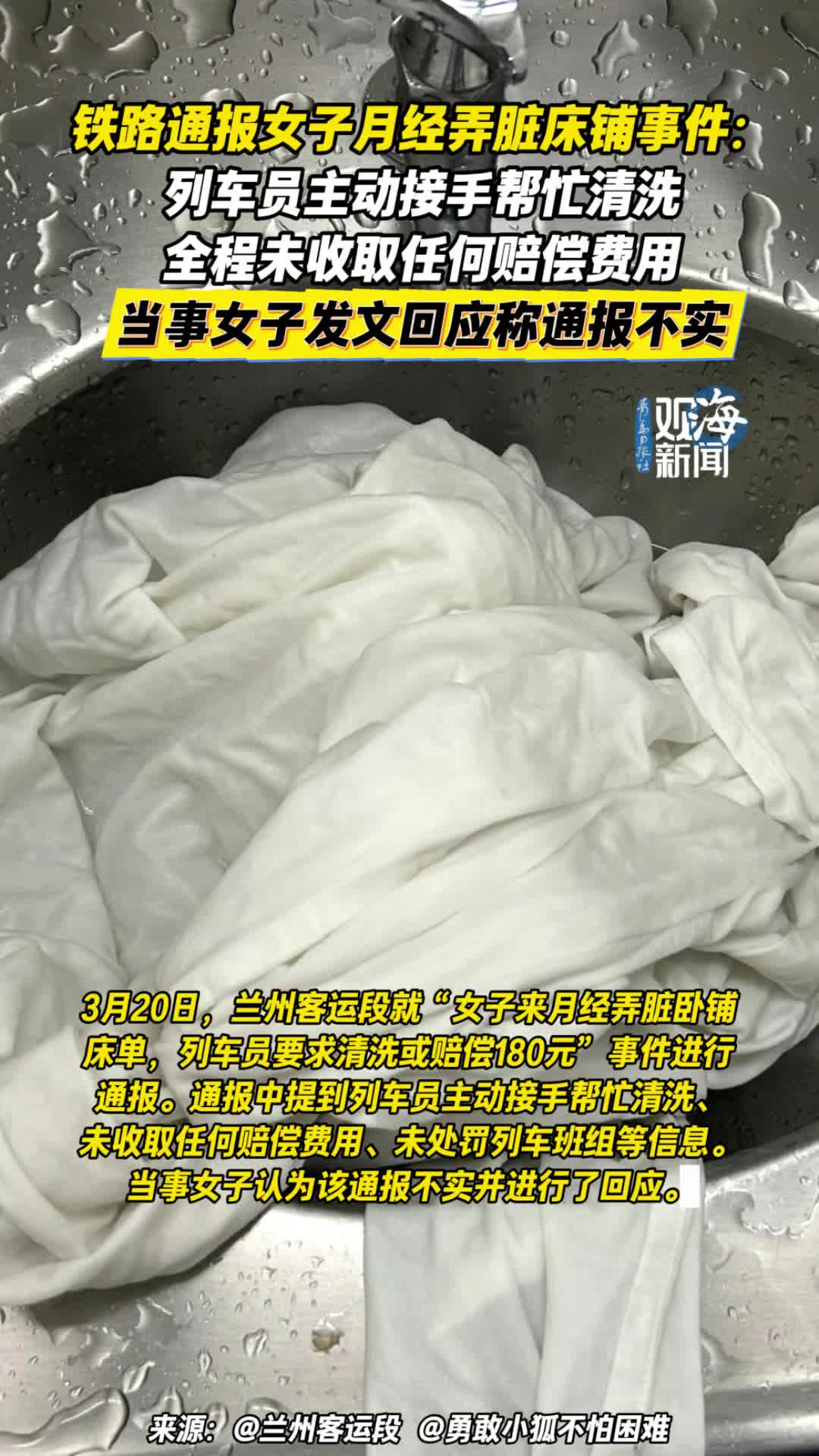 铁路通报女子月经弄脏床铺事件:列车员主动接手帮忙清洗,全程未收取任何赔偿费用。当事女子发文回应称通报不实