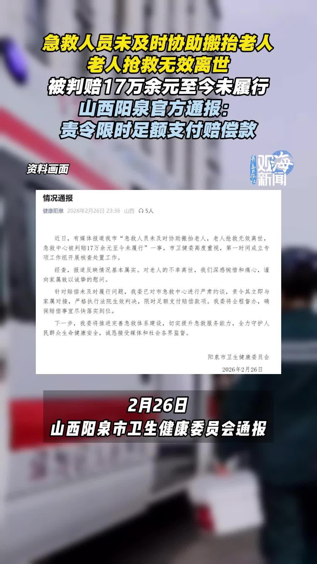 急救人员未及时协助搬抬老人,老人抢救无效离世,被判赔17万余元至今未履行