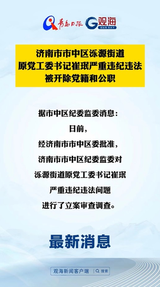 济南市市中区泺源街道原党工委书记崔珉严重违纪违法被开除党籍和公职