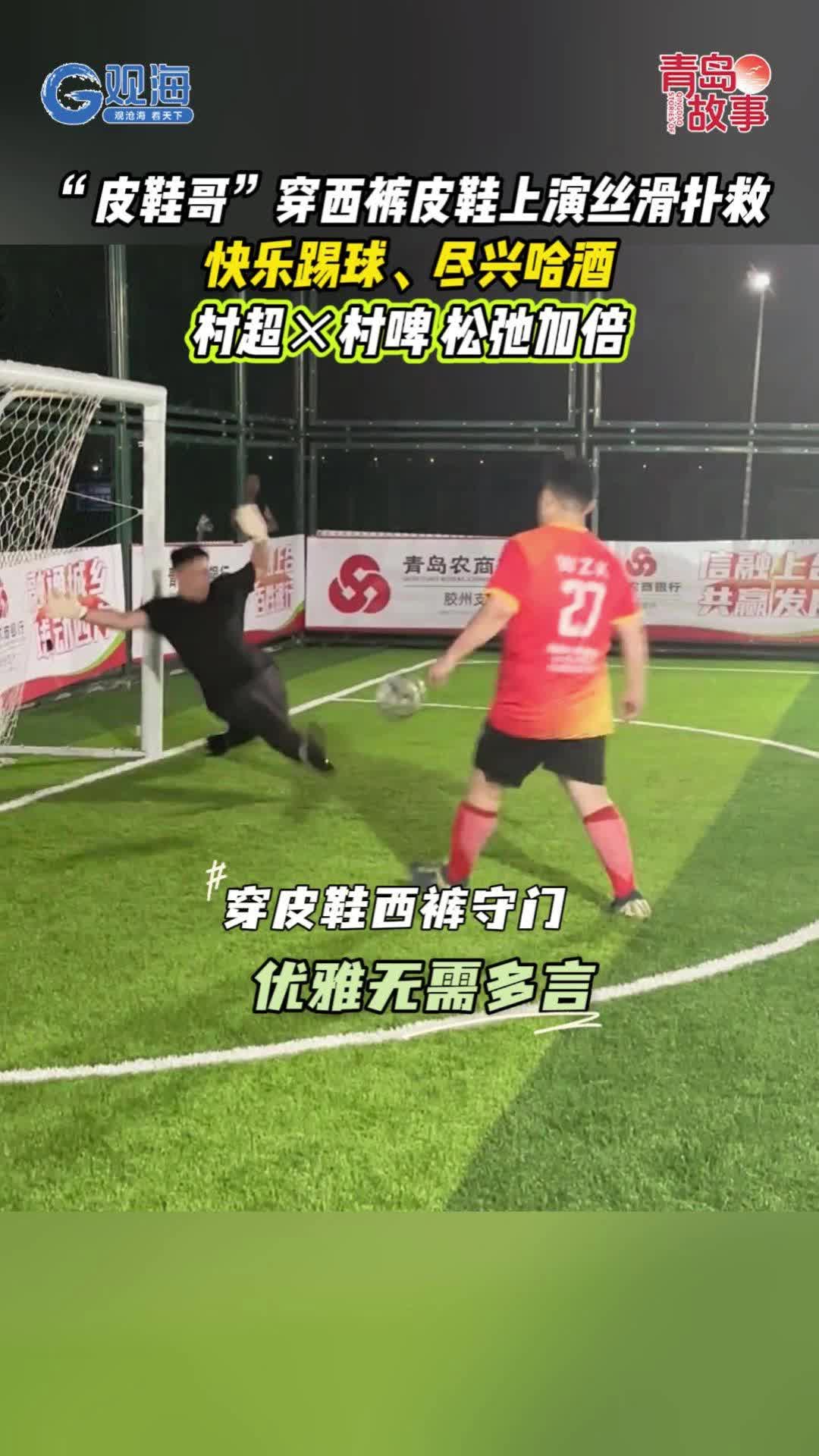 “皮鞋哥”穿西裤皮鞋上演丝滑扑救,村超×村啤,松弛加倍!