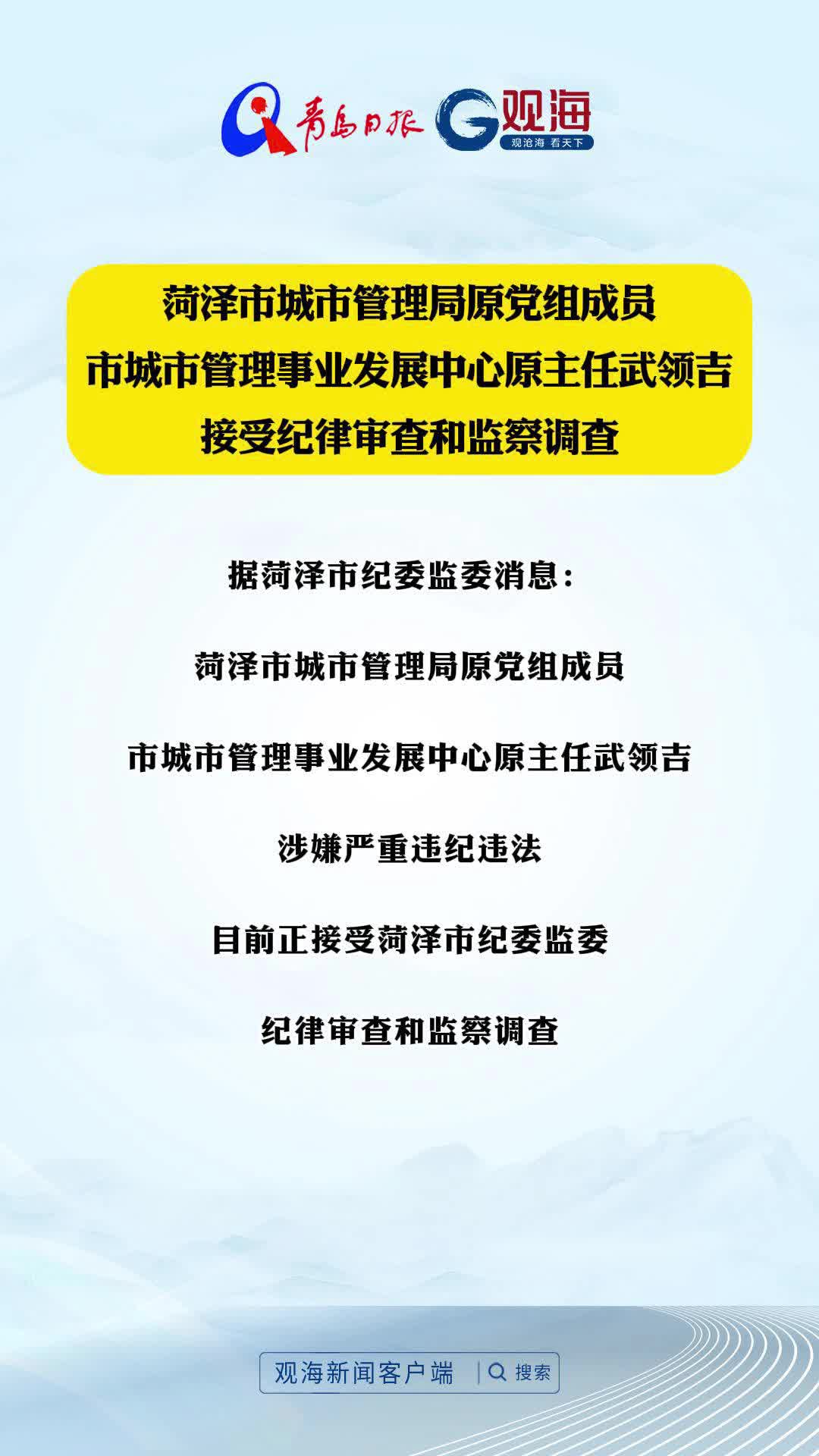 菏泽市城市管理局原党组成员,市城市管理事业发展中心原主任武领吉接受纪律审查和监察调查