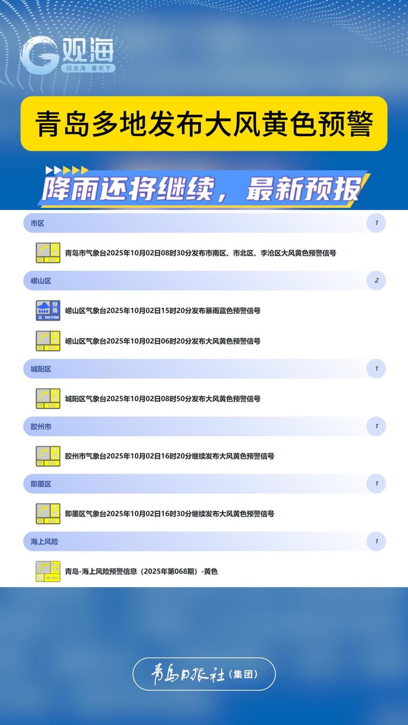 青岛多地发布大风黄色预警,降雨还将继续,最新预报