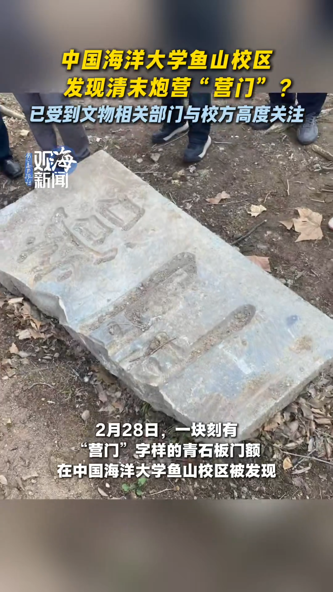 中国海洋大学鱼山校区发现“营门”门额,目前校方已组织转运