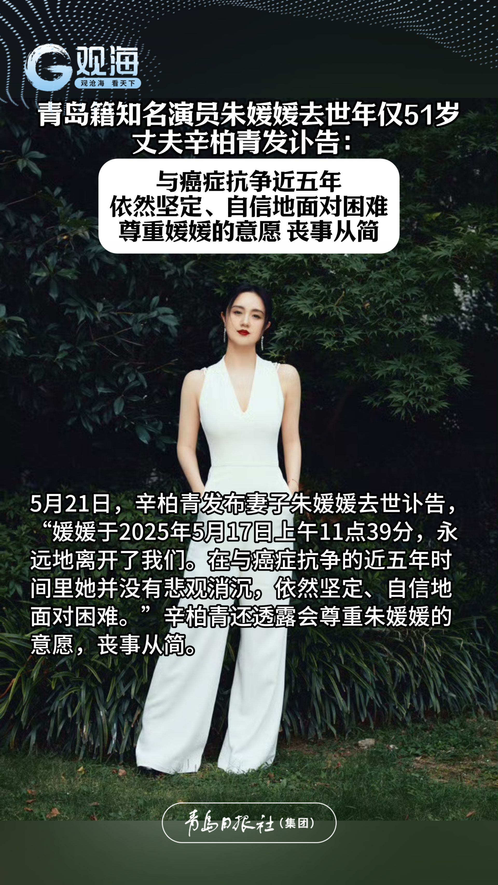 青岛籍知名演员朱媛媛去世,年仅51岁。丈夫辛柏青发讣告:与癌症抗争近五年,依然坚定、自信地面对困难,尊重媛媛的意愿,丧事从简