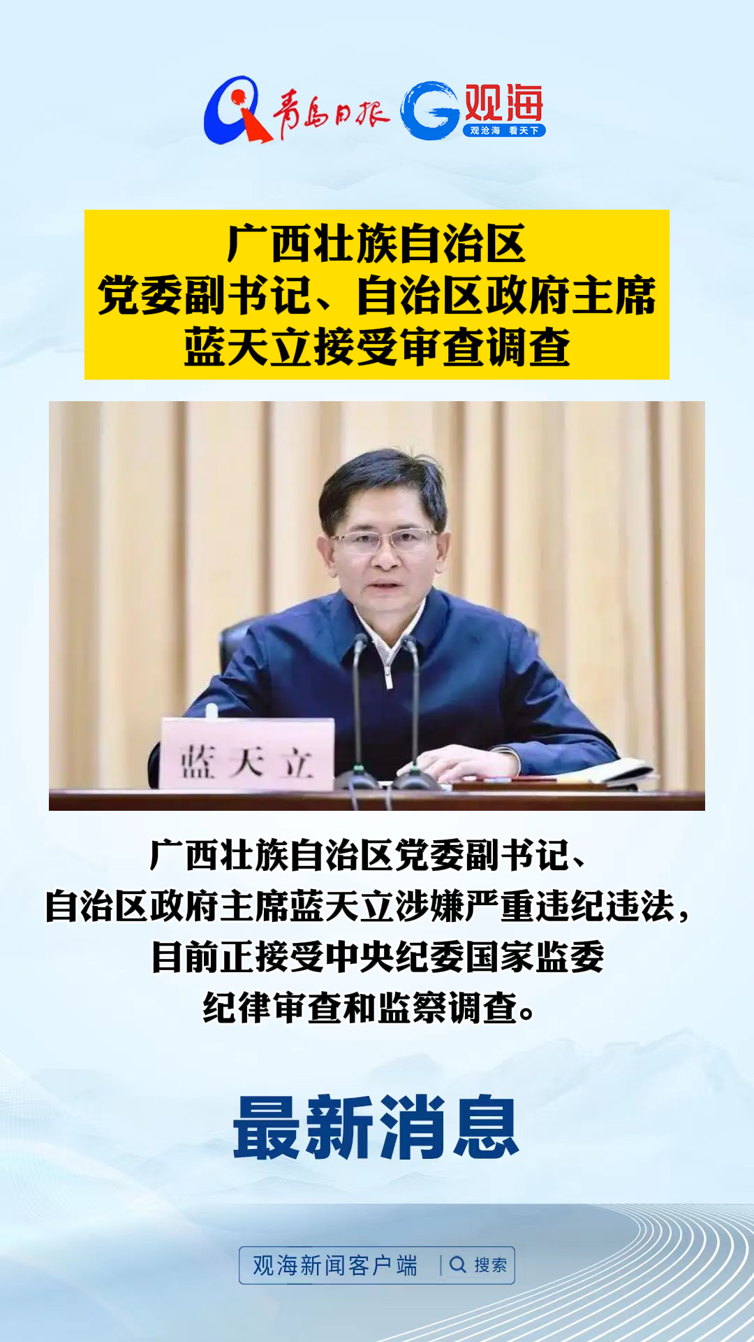 广西壮族自治区党委副书记、自治区政府主席蓝天立接受审查调查