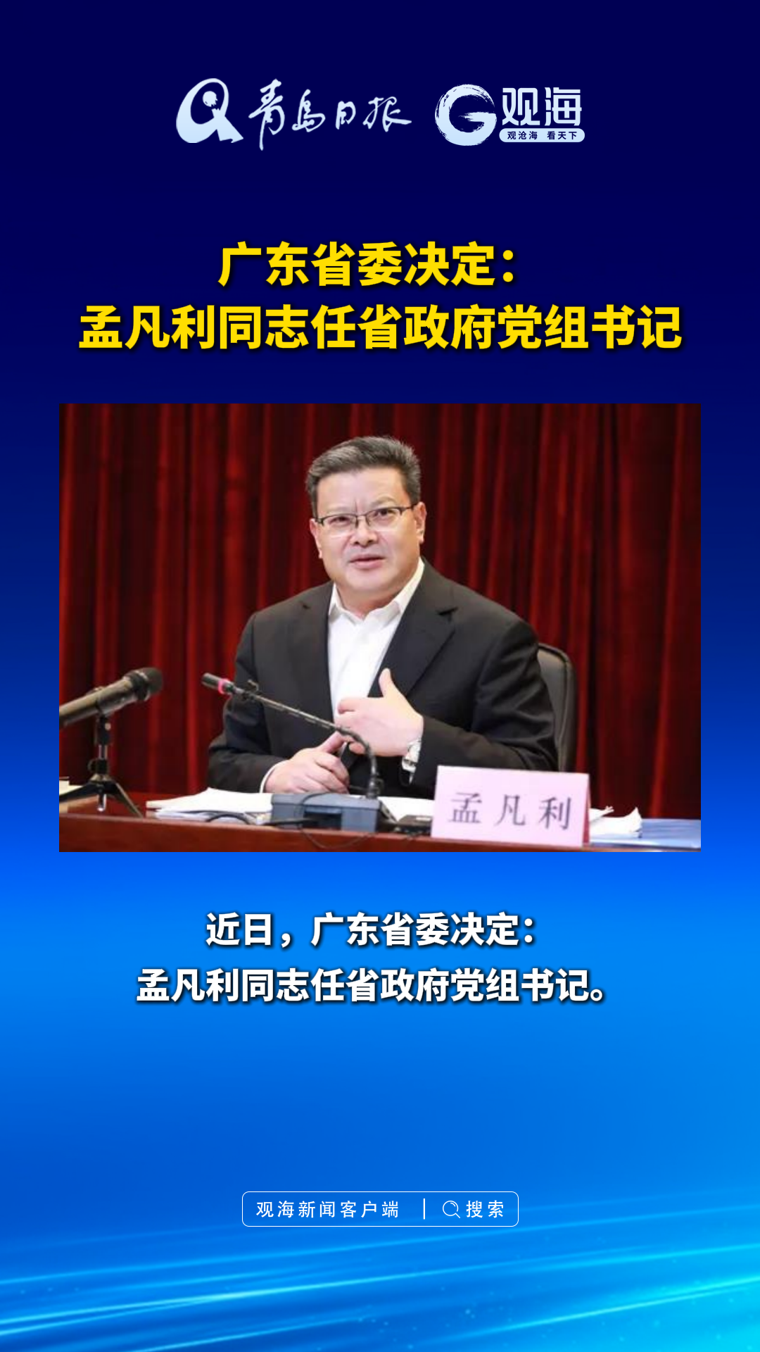 广东省委决定:孟凡利同志任省政府党组书记