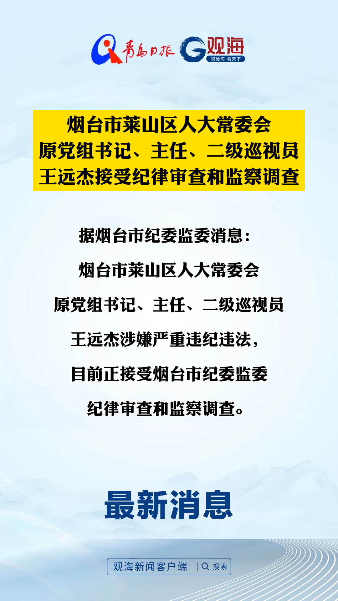 烟台市莱山区人大常委会原党组书记、主任、二级巡视员王远杰接受纪律审查和监察调查