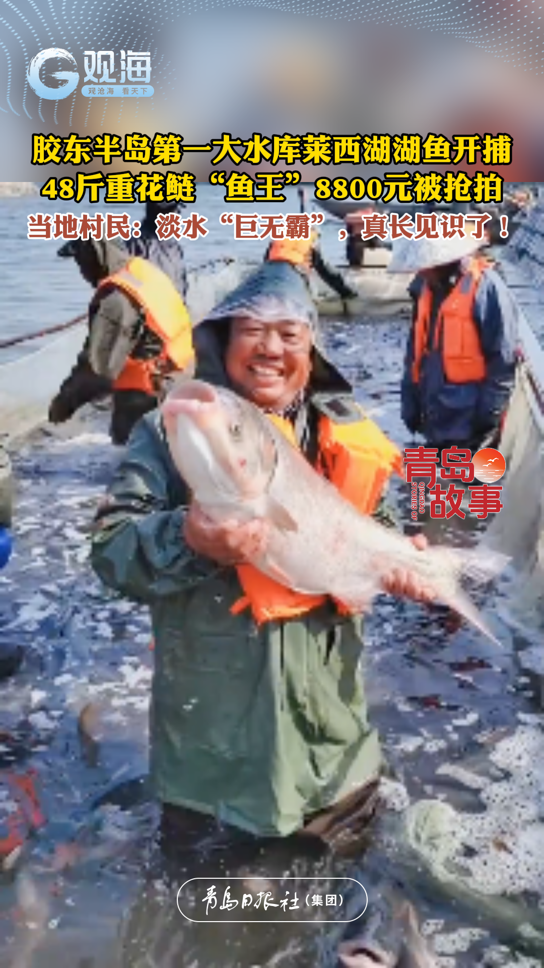 胶东半岛第一大水库莱西湖湖鱼开捕,48斤重花鲢“鱼王”8800元被抢拍