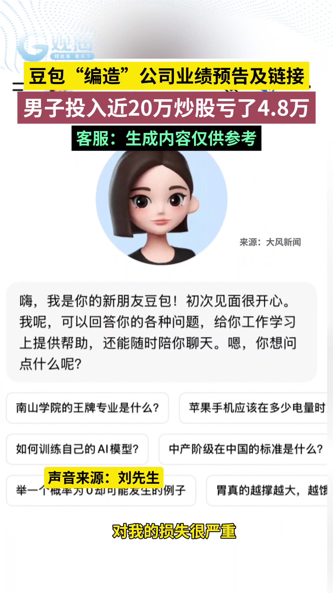 日前,豆包“编造”公司业绩预告及链接,男子投近20万炒股赔4.8万