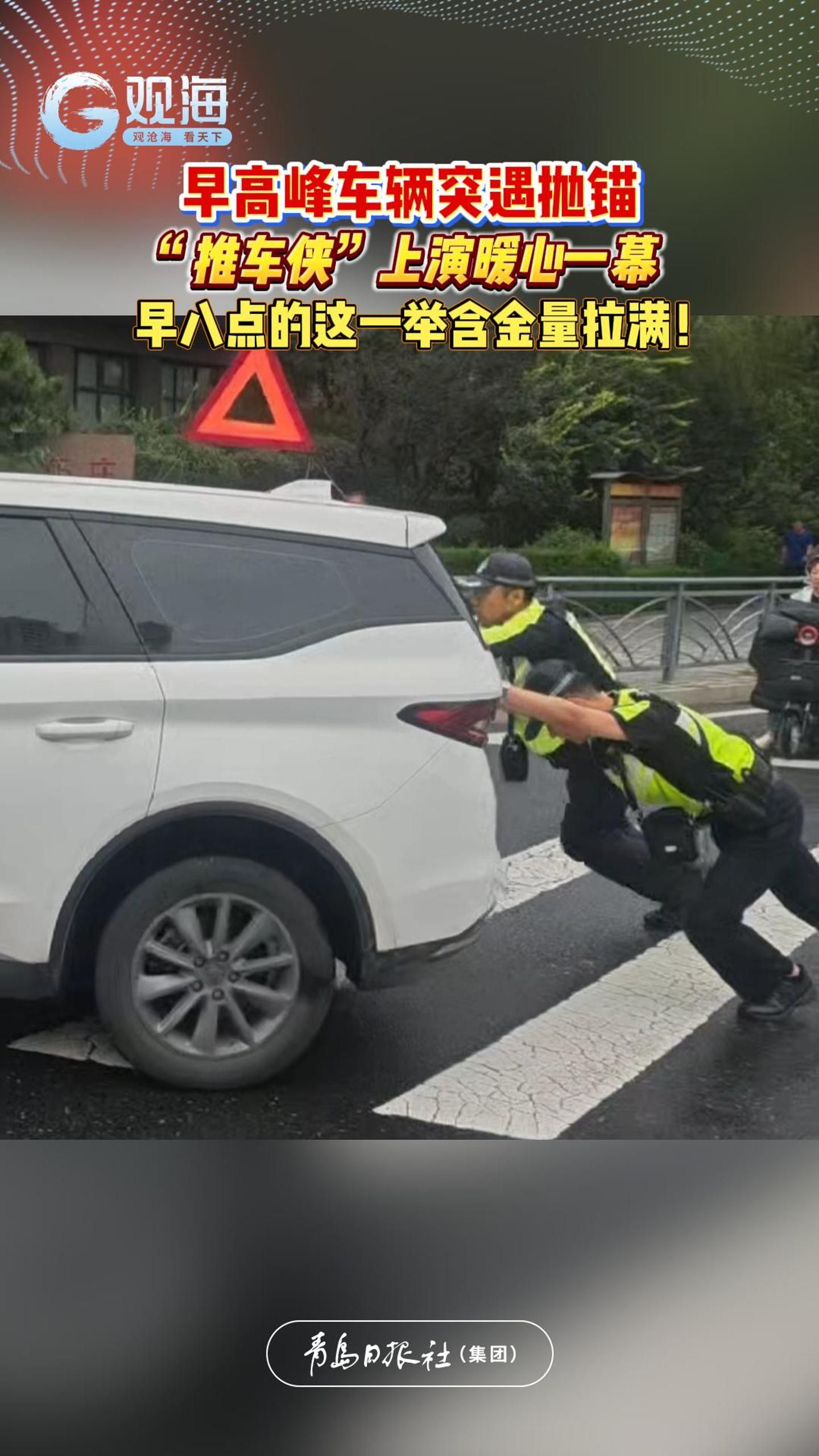 青岛街头暖心一幕!早高峰车辆突遇抛锚,交警秒变“推车侠”