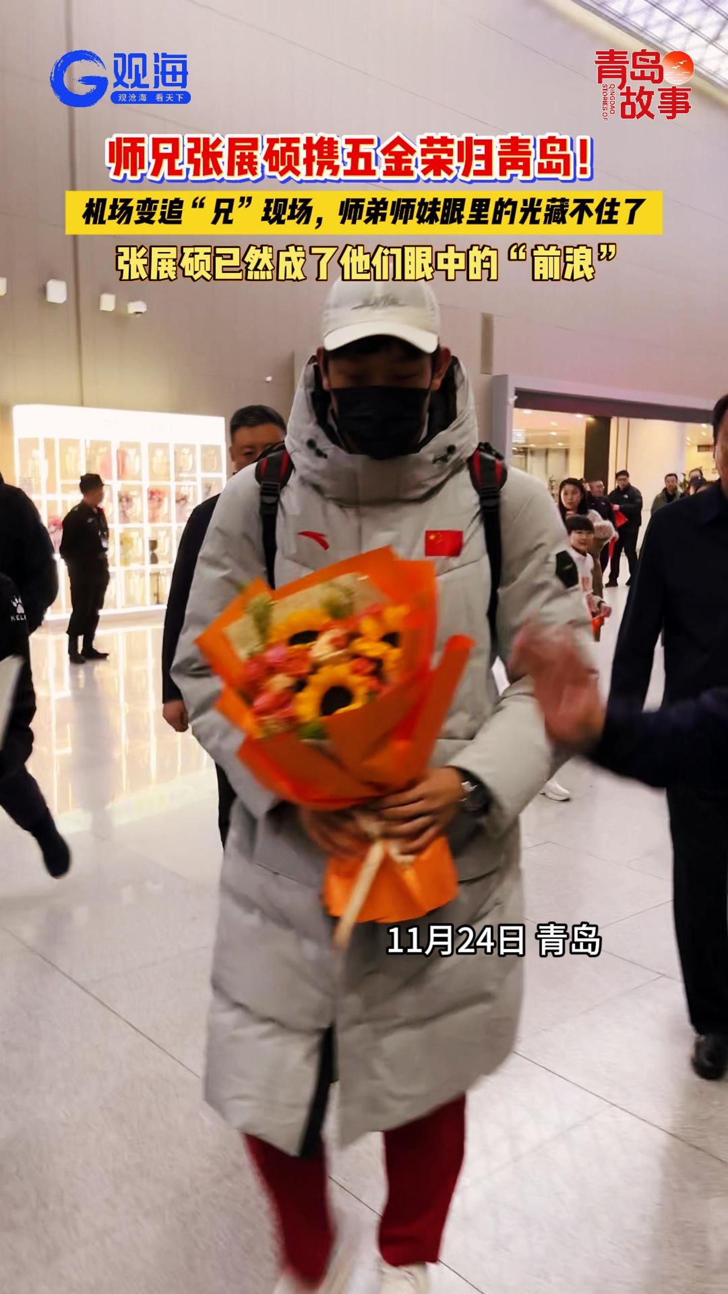 师兄张展硕携五金荣归青岛,机场变追“兄”现场,师弟师妹眼里的光藏不住了!
