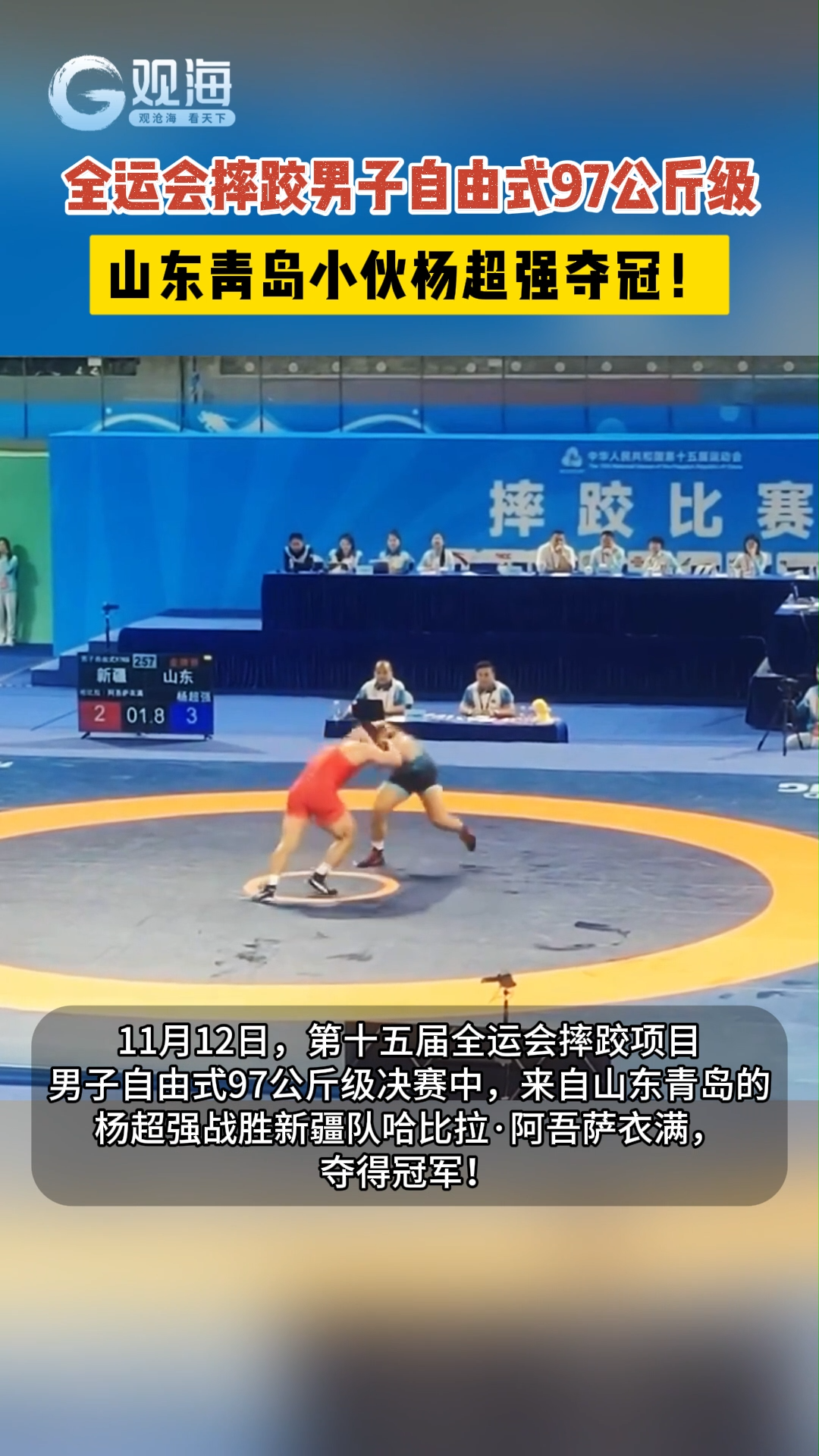 青岛小伙杨超强,勇夺十五运会摔跤男子自由式97公斤级金牌!