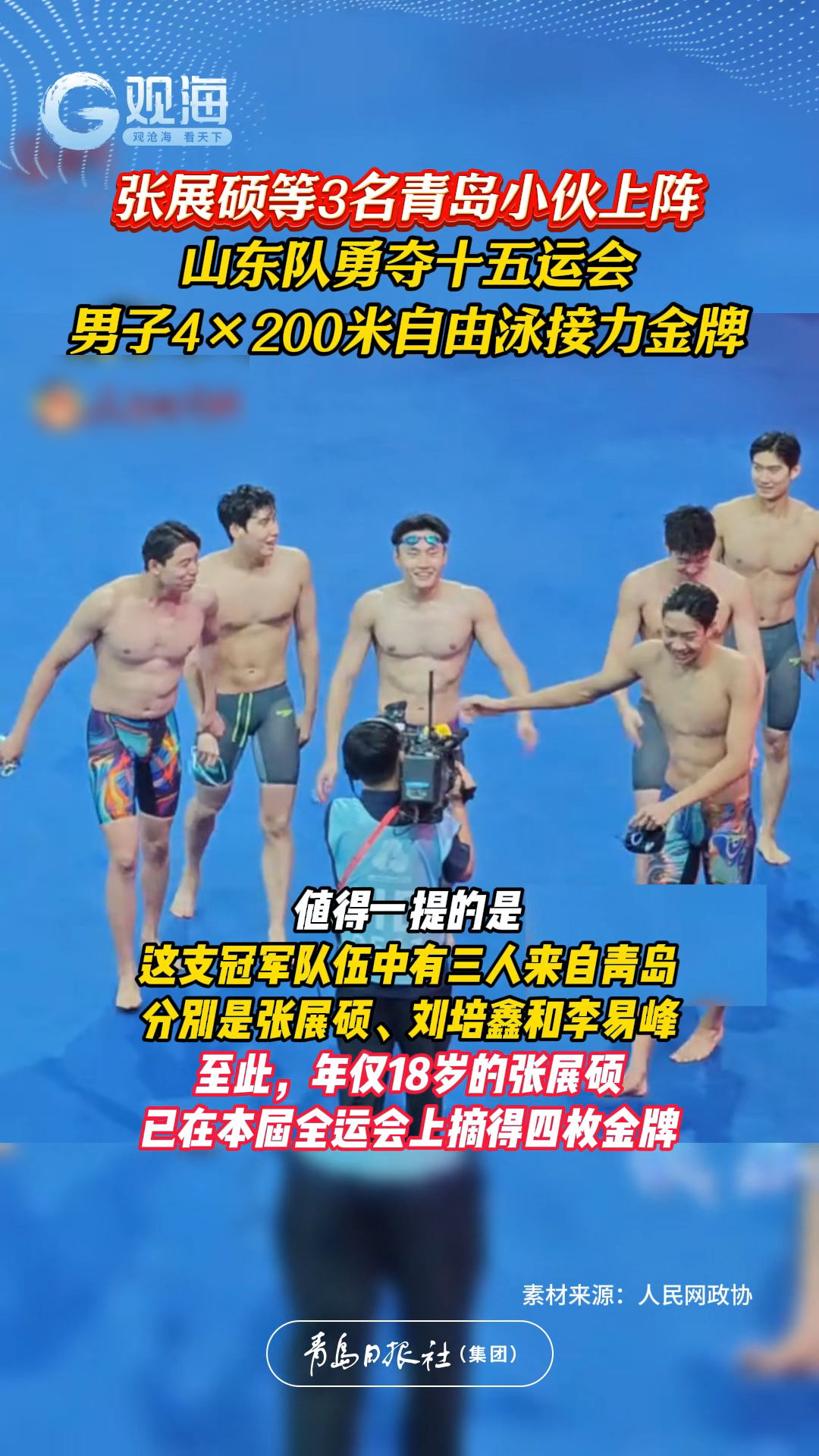 张展硕等3名青岛小伙上阵,山东队勇夺十五运会男子4×200米自由泳接力金牌