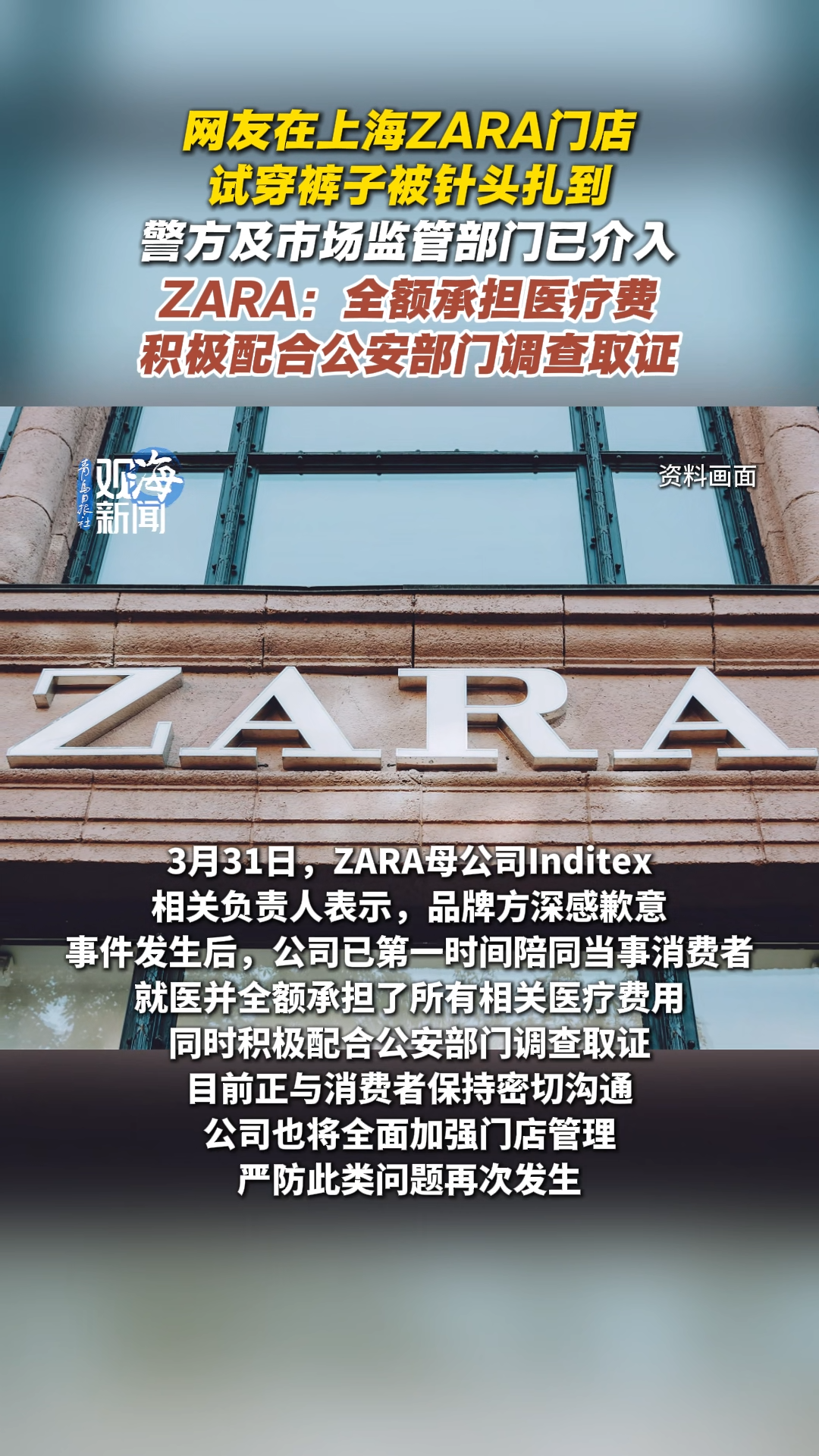 网友在上海Zara门店试穿裤子被针头扎到,警方及市场监督部门已介入