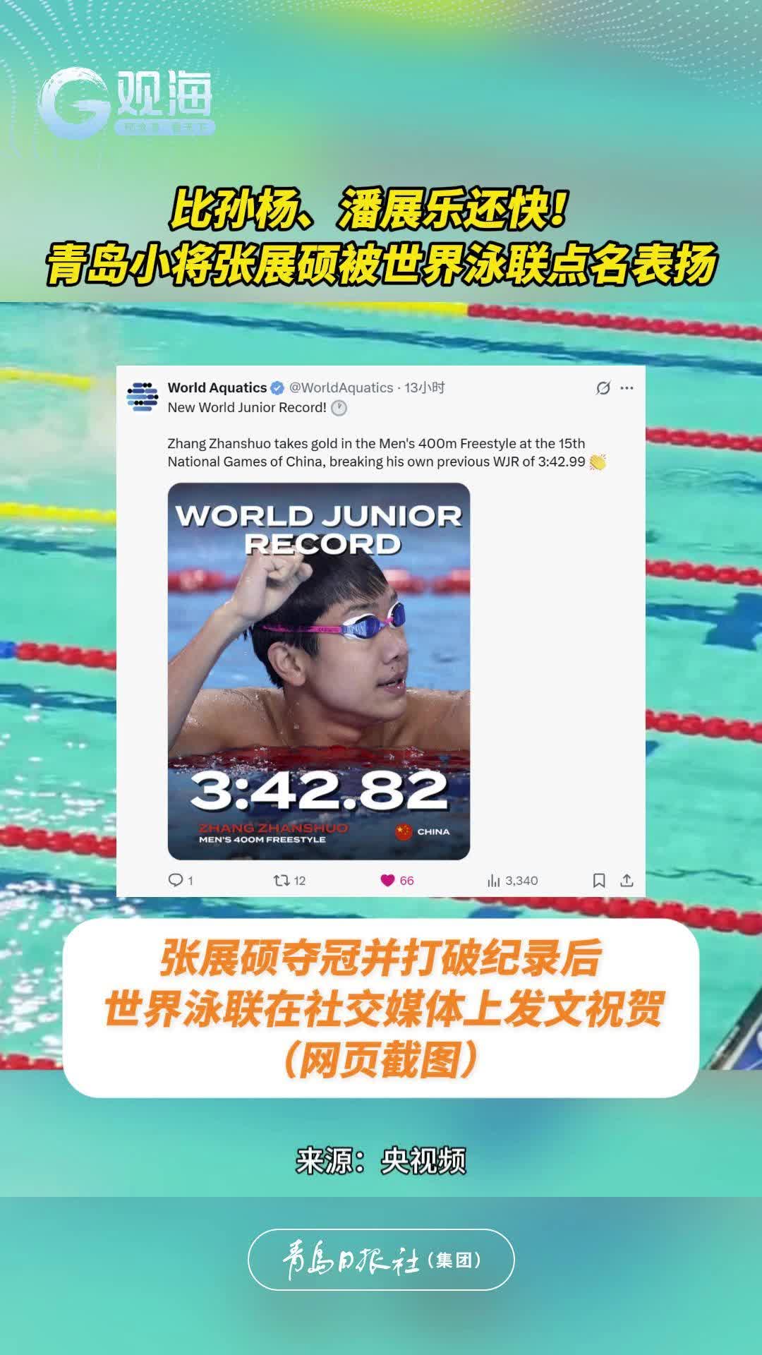 比孙杨、潘展乐还快!青岛小将张展硕被世界泳联点名表扬