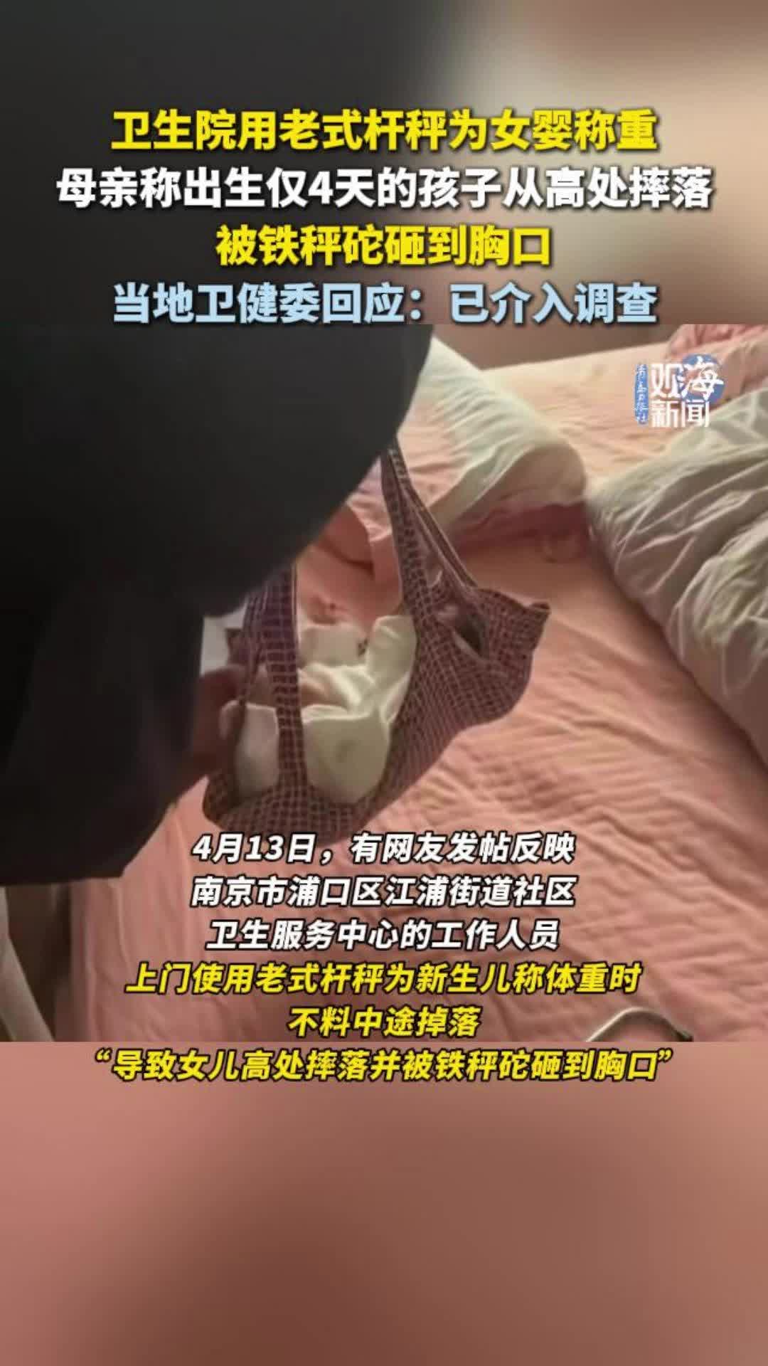 卫生院用老式杆秤为女婴称重,母亲称出生仅4天的孩子从高处摔落,被铁秤砣砸到胸口,当地卫健委回应:已介入调查