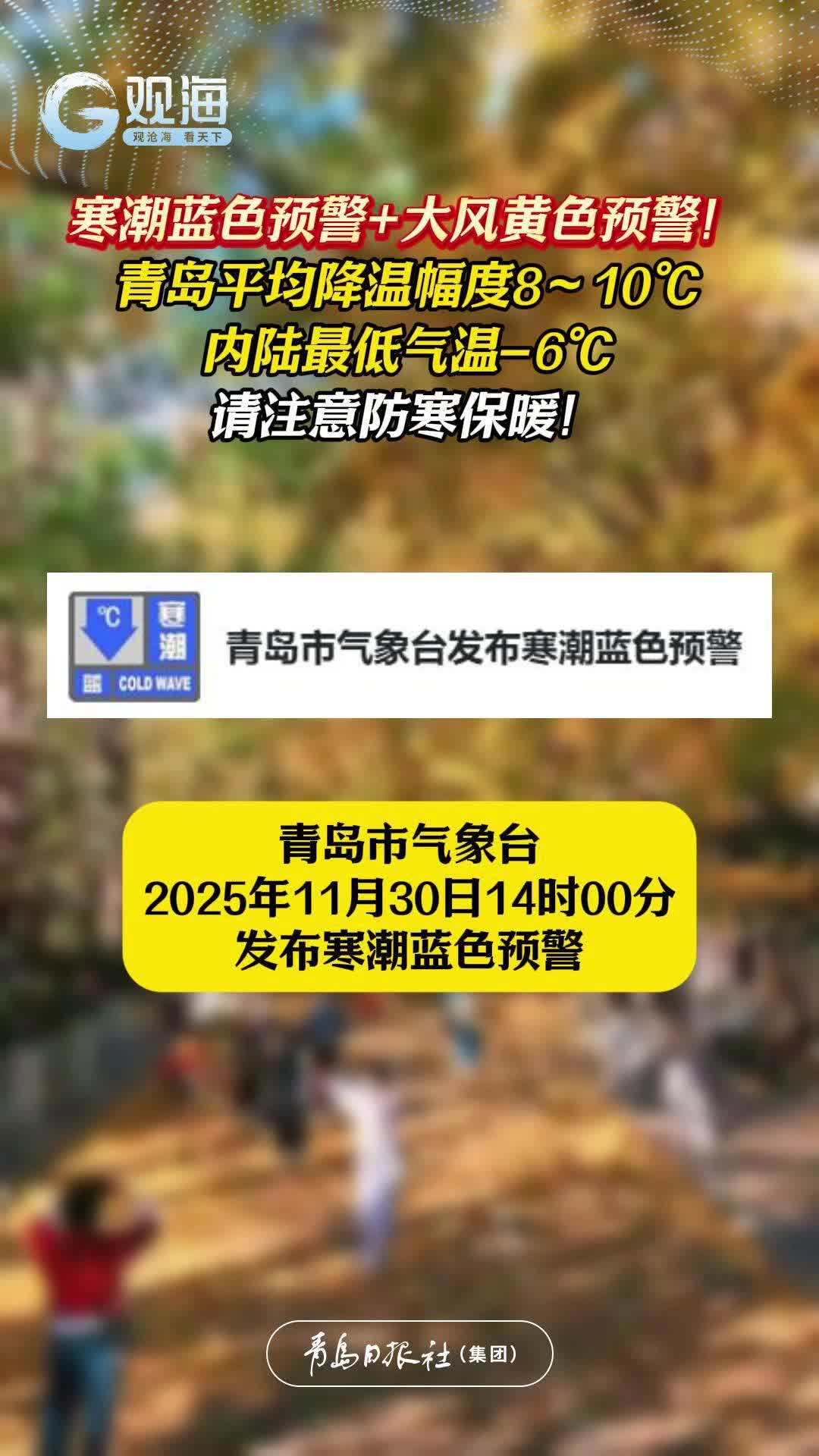 寒潮蓝色预警+大风黄色预警!青岛平均降温幅度8~10℃,内陆最低气温-6℃