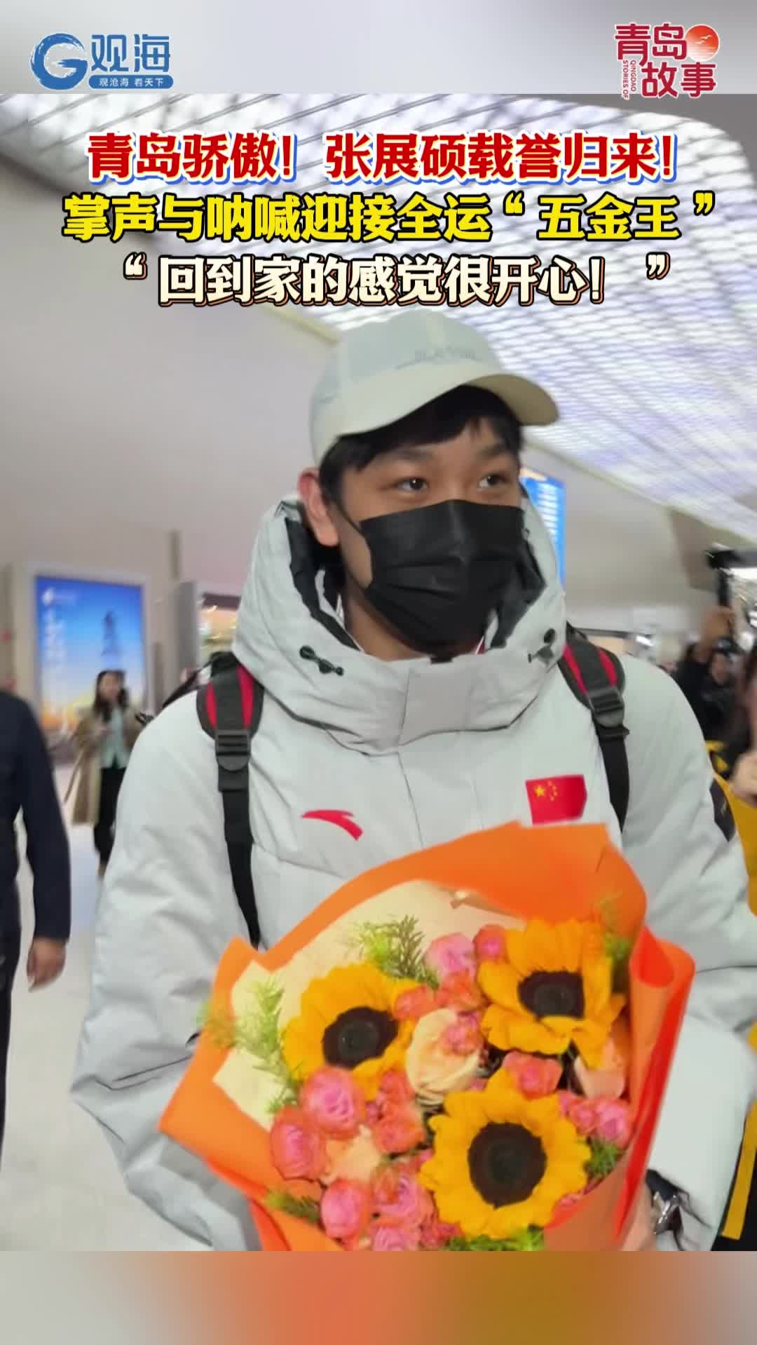 青岛骄傲!张展硕载誉回青!鲜花与呐喊迎接全运“五金王”!