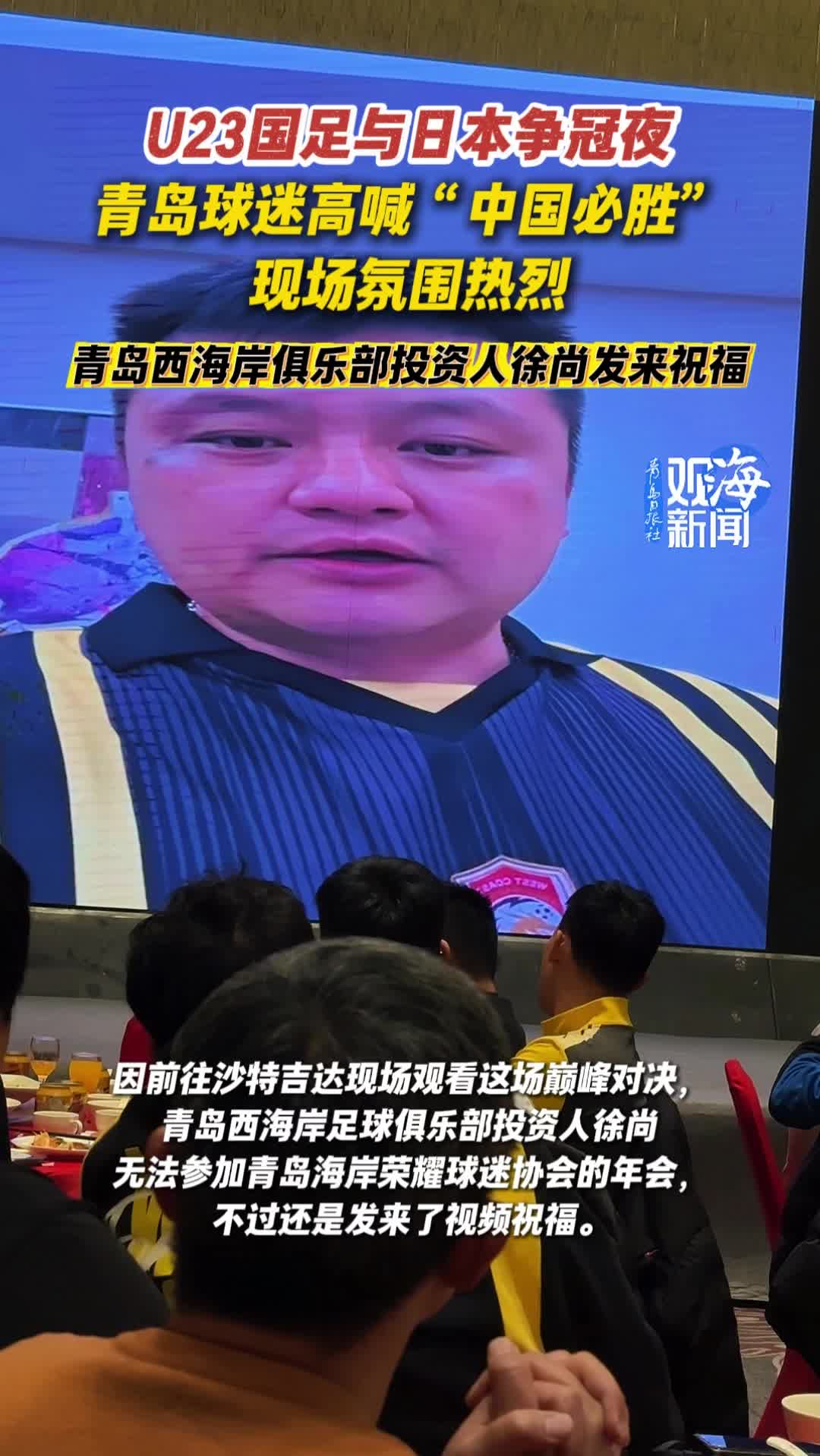U23国足与日本争冠夜,青岛球迷高喊“中国必胜”,现场氛围热烈,青岛西海岸俱乐部投资人徐尚发来祝福