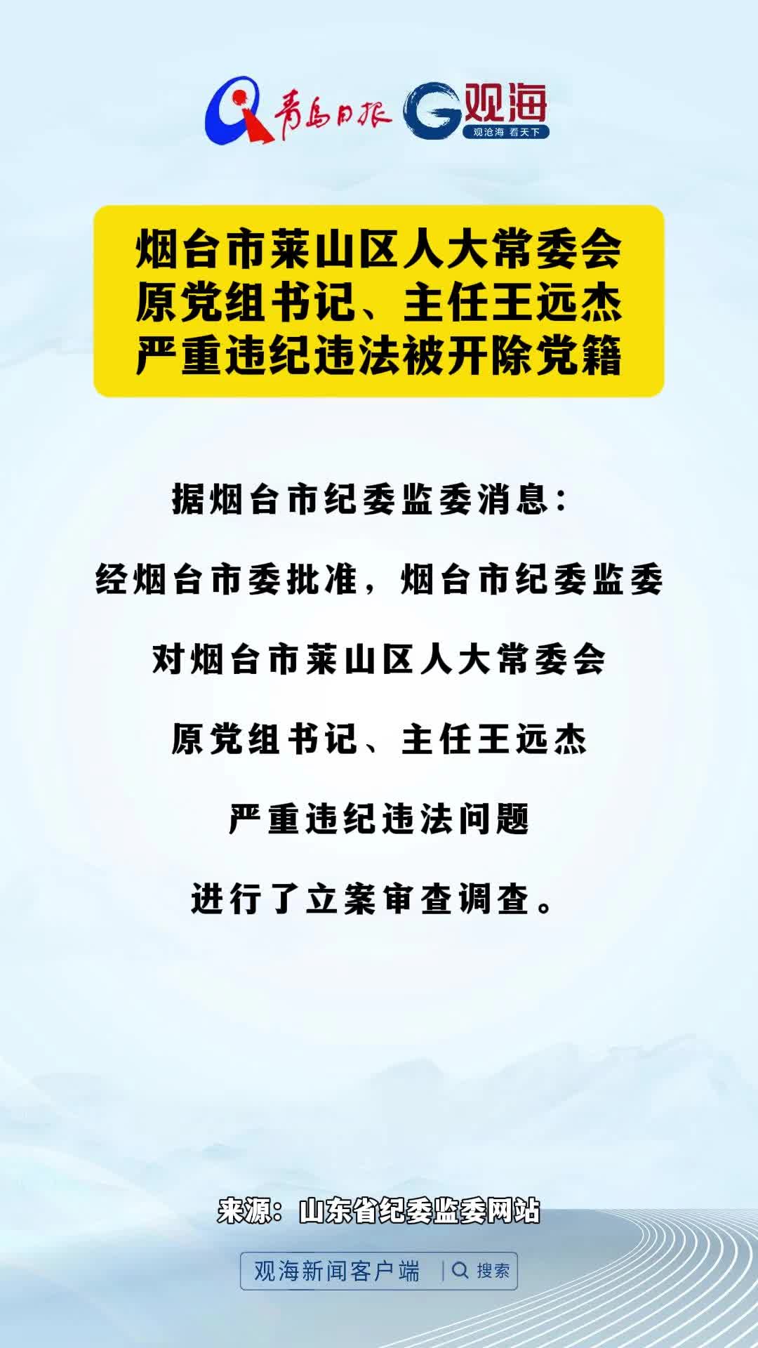 烟台市莱山区人大常委会原党组书记、主任王远杰严重违纪违法被开除党籍