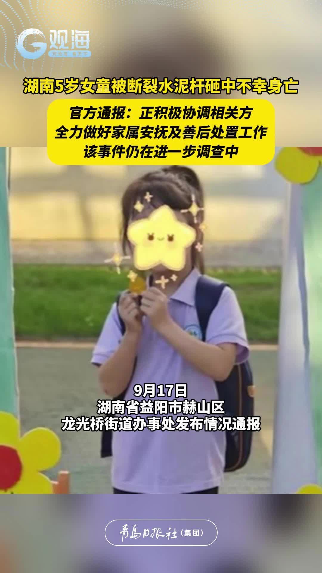 湖南5岁女童被断裂水泥杆砸中不幸身亡,官方通报:正积极协调相关方,全力做好家属安抚及善后处置工作,该事件仍在进一步调查中