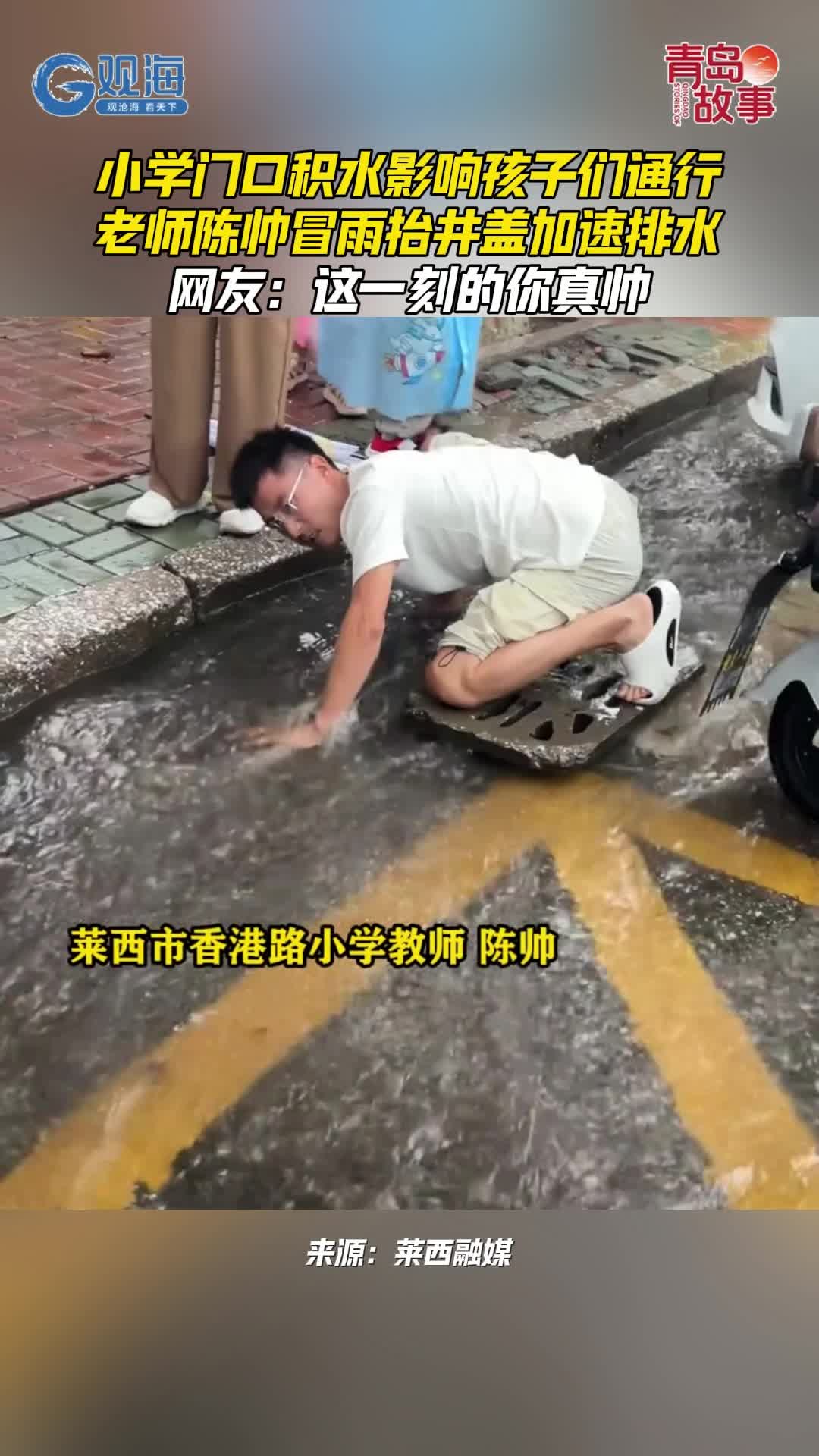 小学门口积水影响孩子们通行,老师陈帅冒雨抬井盖加速排水