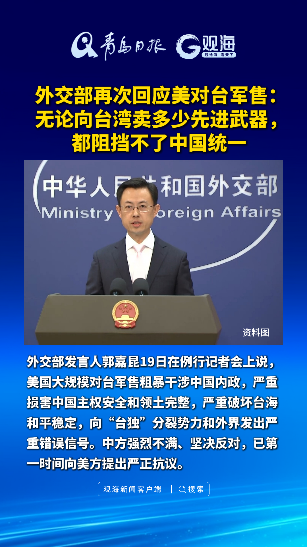 外交部再次回应美对台军售:无论向台湾卖多少先进武器,都阻挡不了中国统一