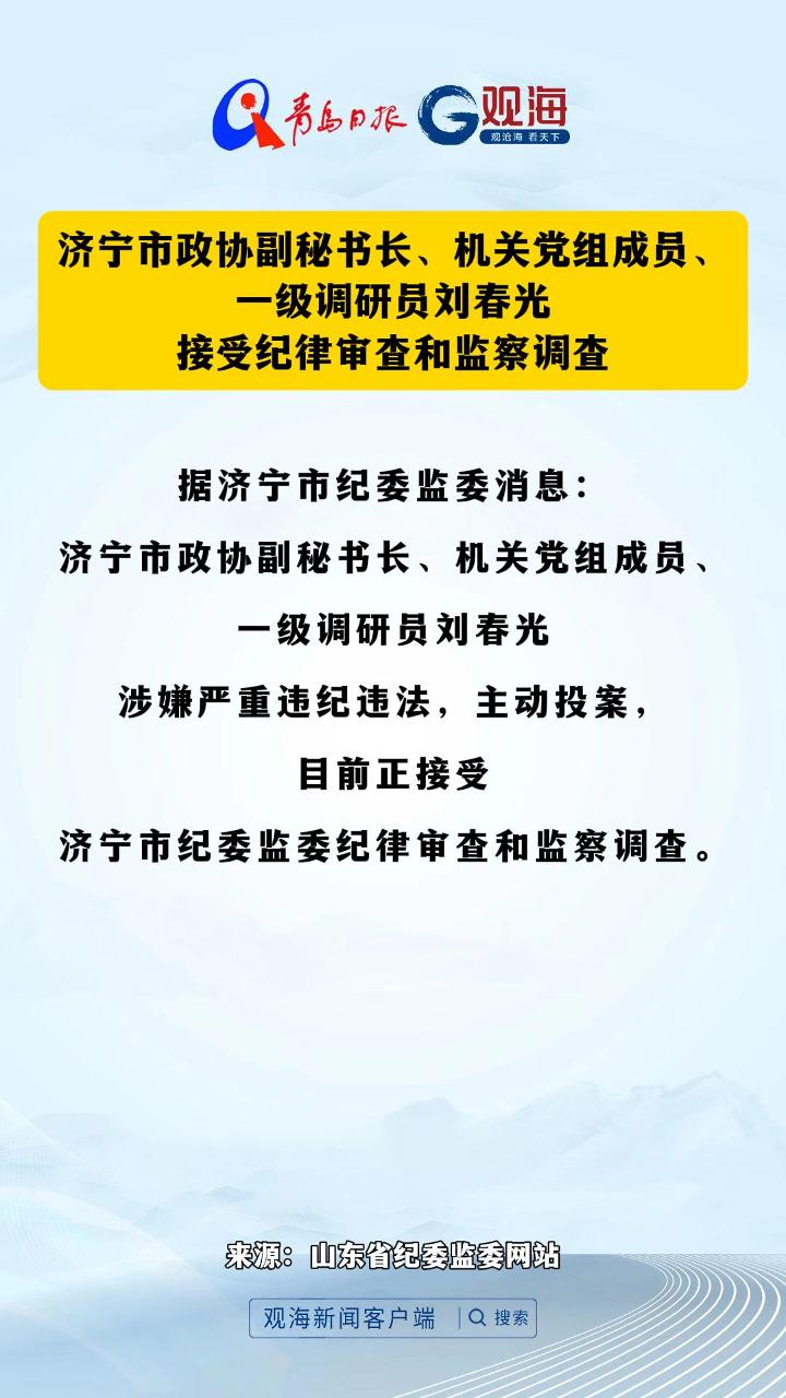 济宁市政协副秘书长、机关党组成员、一级调研员刘春光接受纪律审查和监察调查