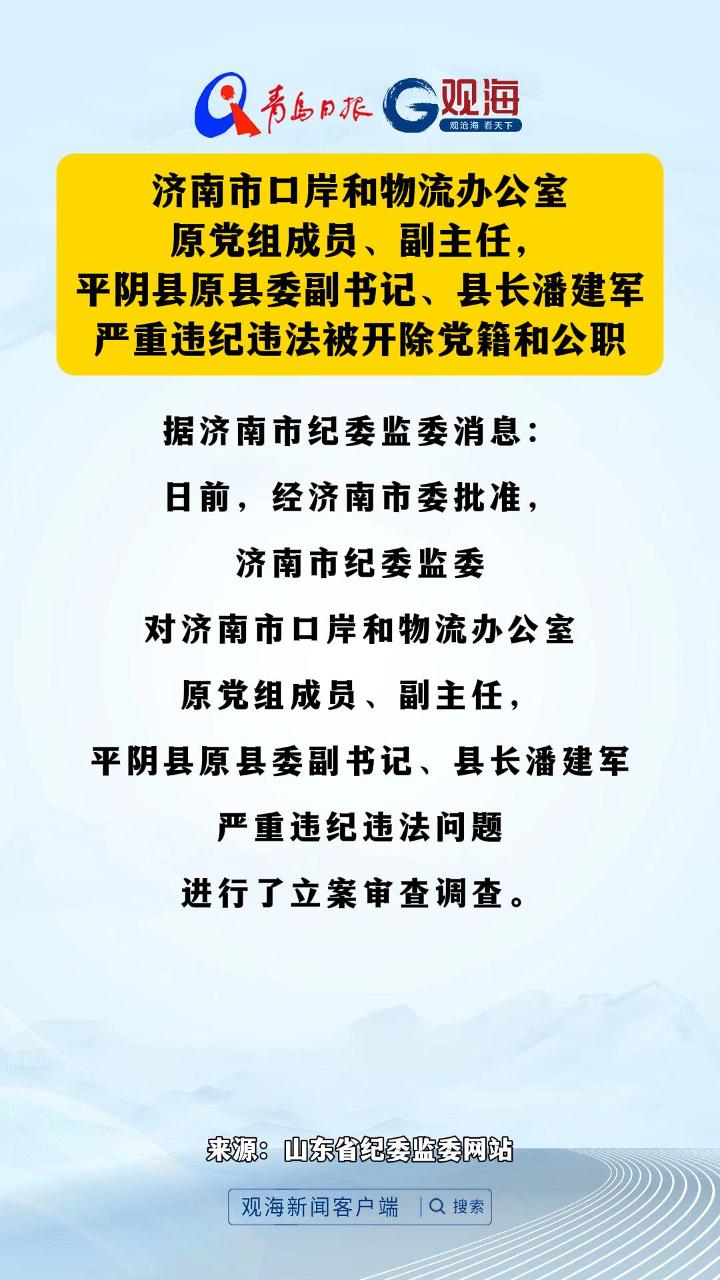 济南市口岸和物流办公室原党组成员、副主任,平阴县原县委副书记、县长潘建军严重违纪违法被开除党籍和公职