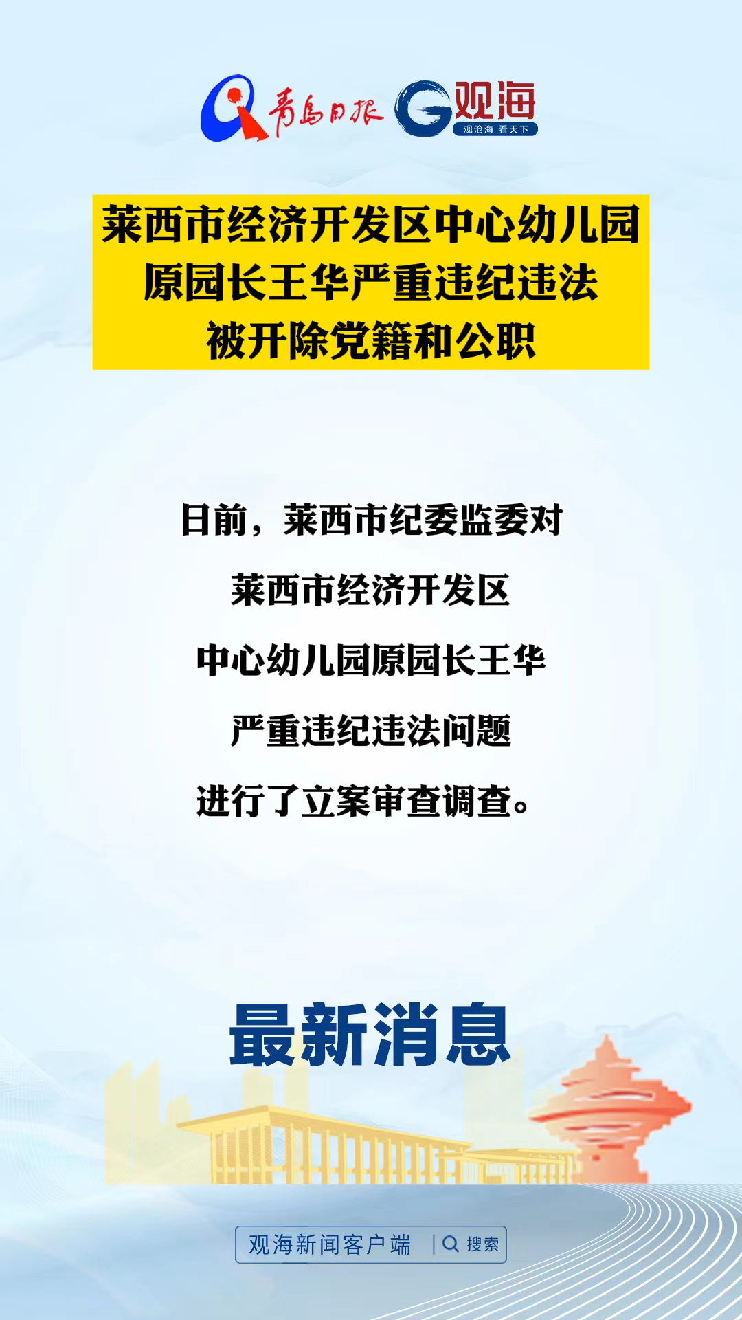 莱西市经济开发区中心幼儿园原园长王华严重违纪违法被开除党籍和公职