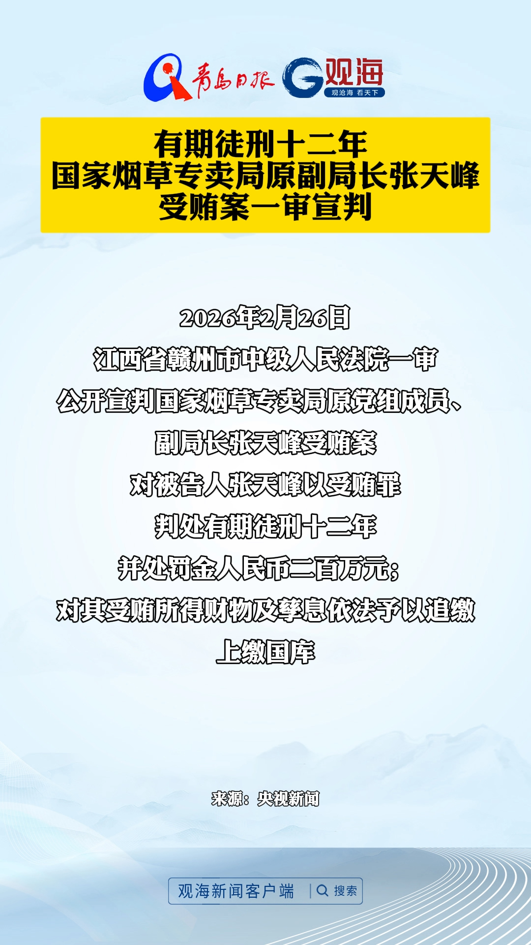 有期徒刑十二年 国家烟草专卖局原副局长张天峰受贿案一审宣判
