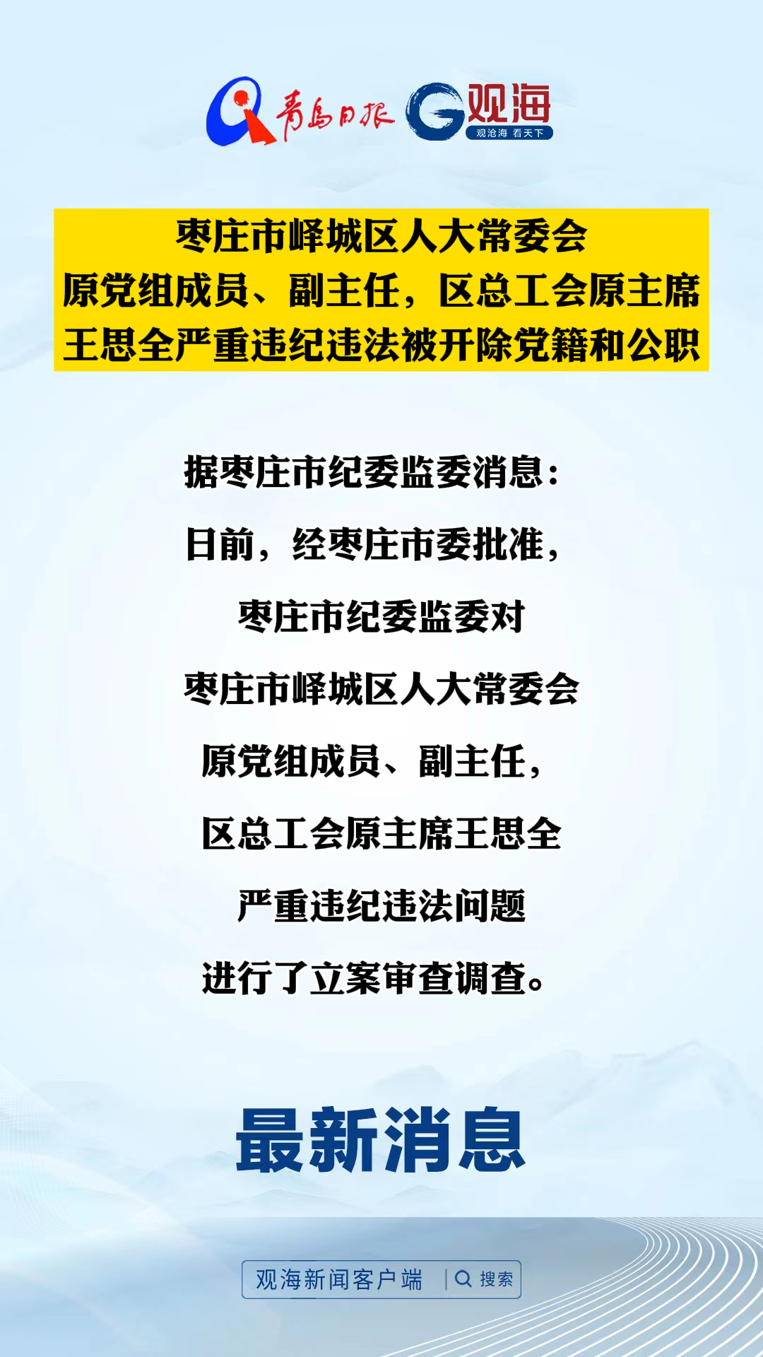 枣庄市峄城区人大常委会原党组成员、副主任,区总工会原主席王思全严重违纪违法被开除党籍和公职