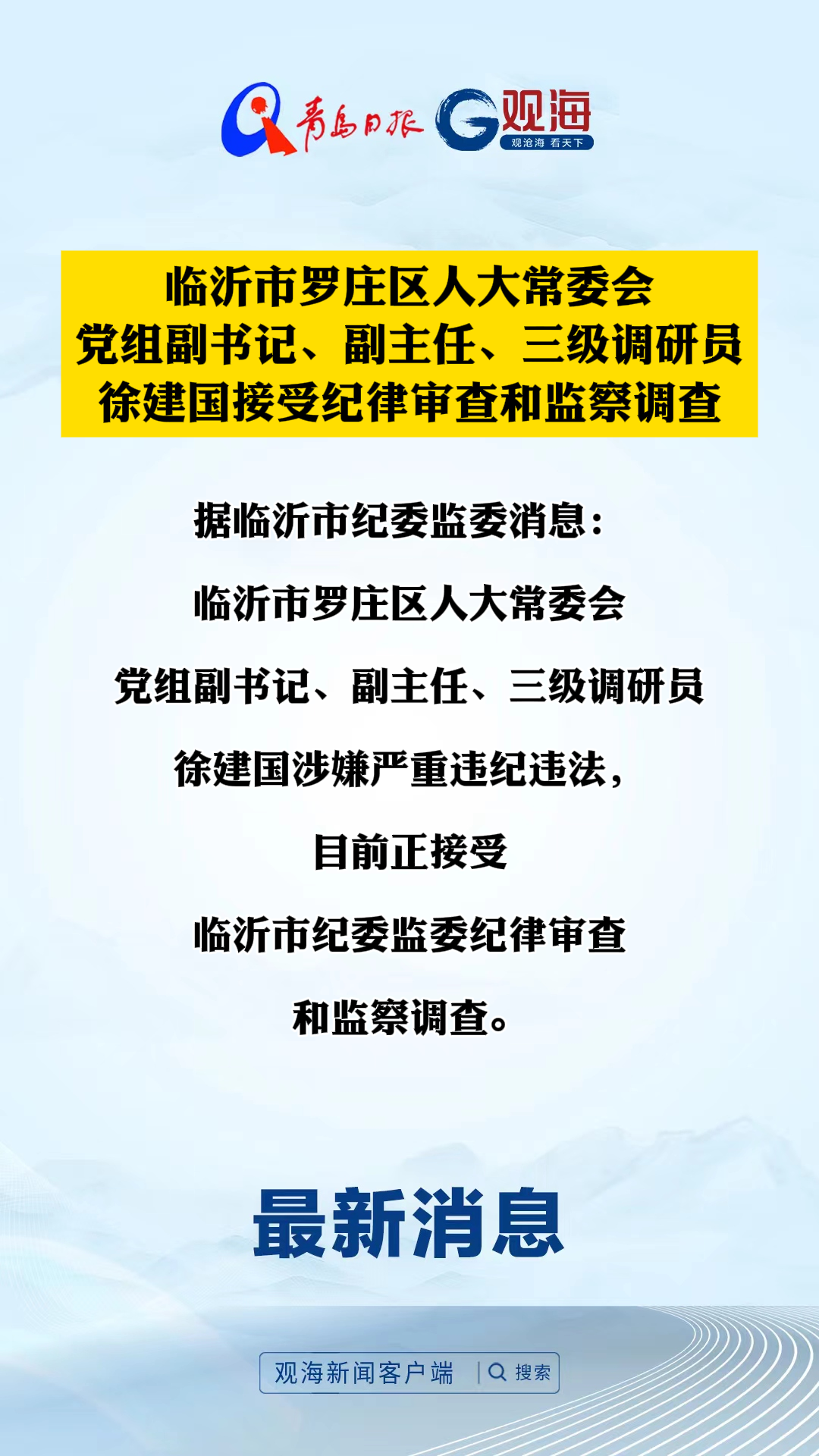 临沂市罗庄区人大常委会党组副书记、副主任、三级调研员徐建国接受纪律审查和监察调查