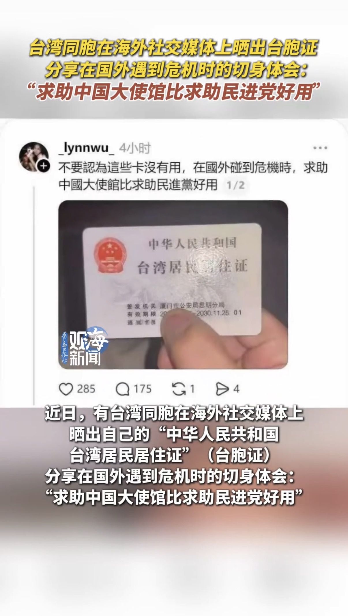 “求助中国大使馆比求助民进党好用”,台湾同胞在海外社交媒体上晒出台胞证