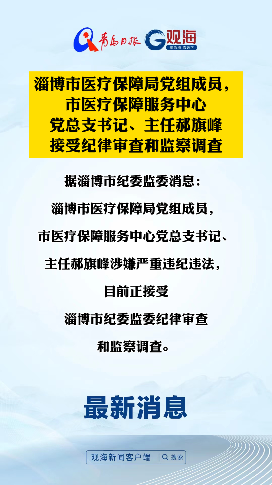 淄博市医疗保障局党组成员,市医疗保障服务中心党总支书记、主任郝旗峰接受纪律审查和监察调查