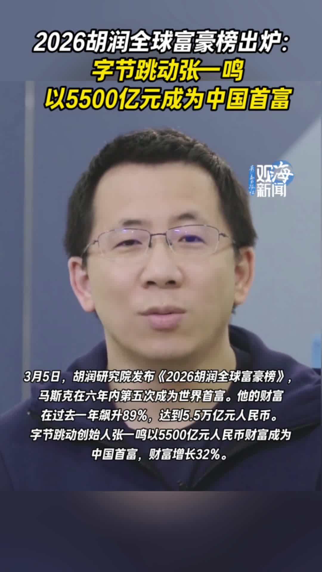 2026胡润全球富豪榜出炉:字节跳动张一鸣以5500亿元成为中国首富