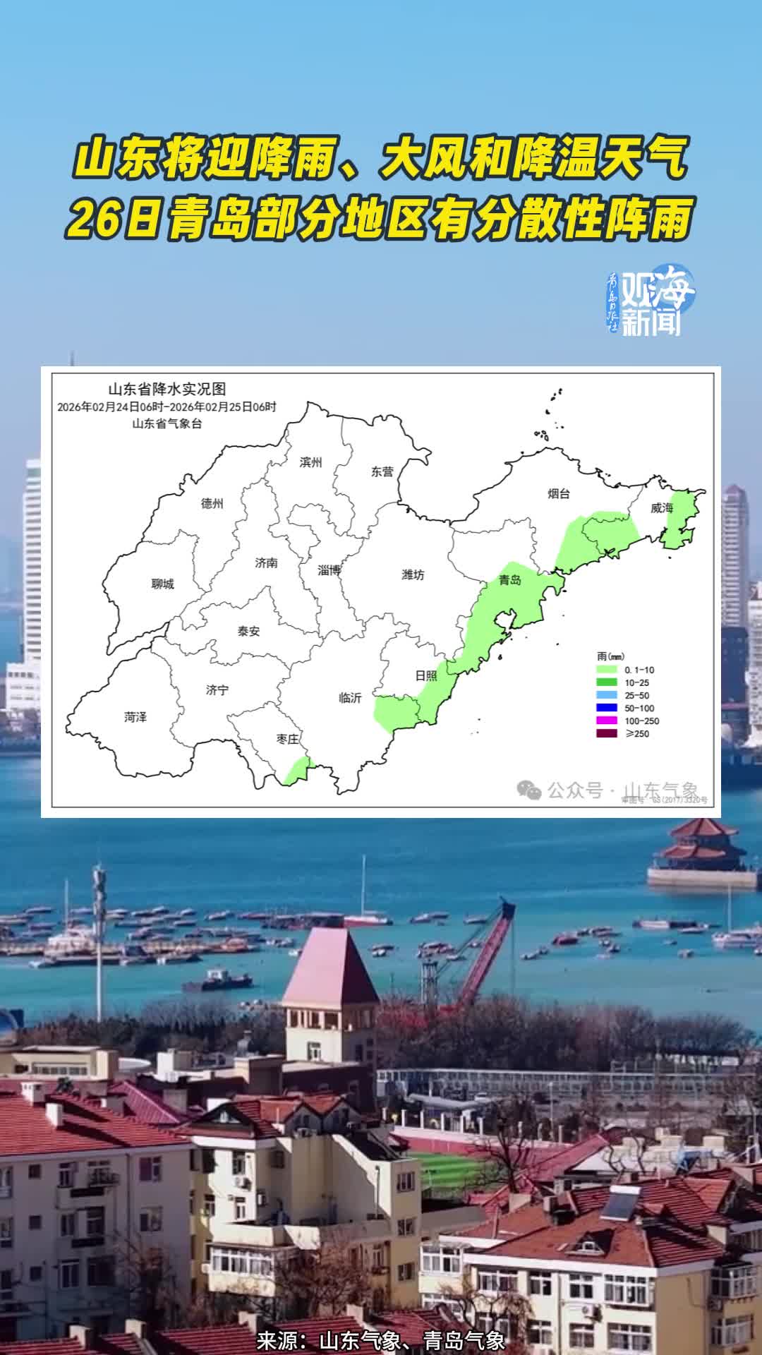 山东将迎降雨、大风和降温天气,26日青岛部分地区有分散性阵雨