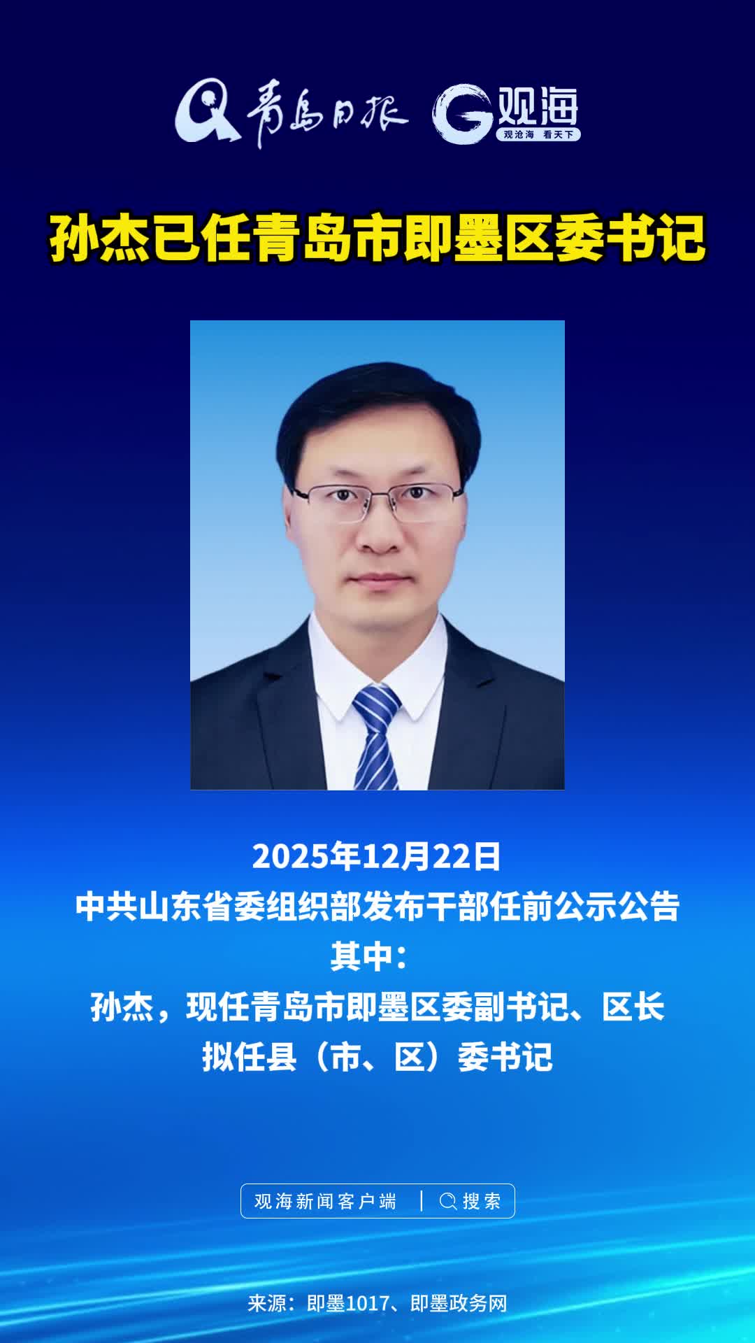 孙杰已任青岛市即墨区委书记