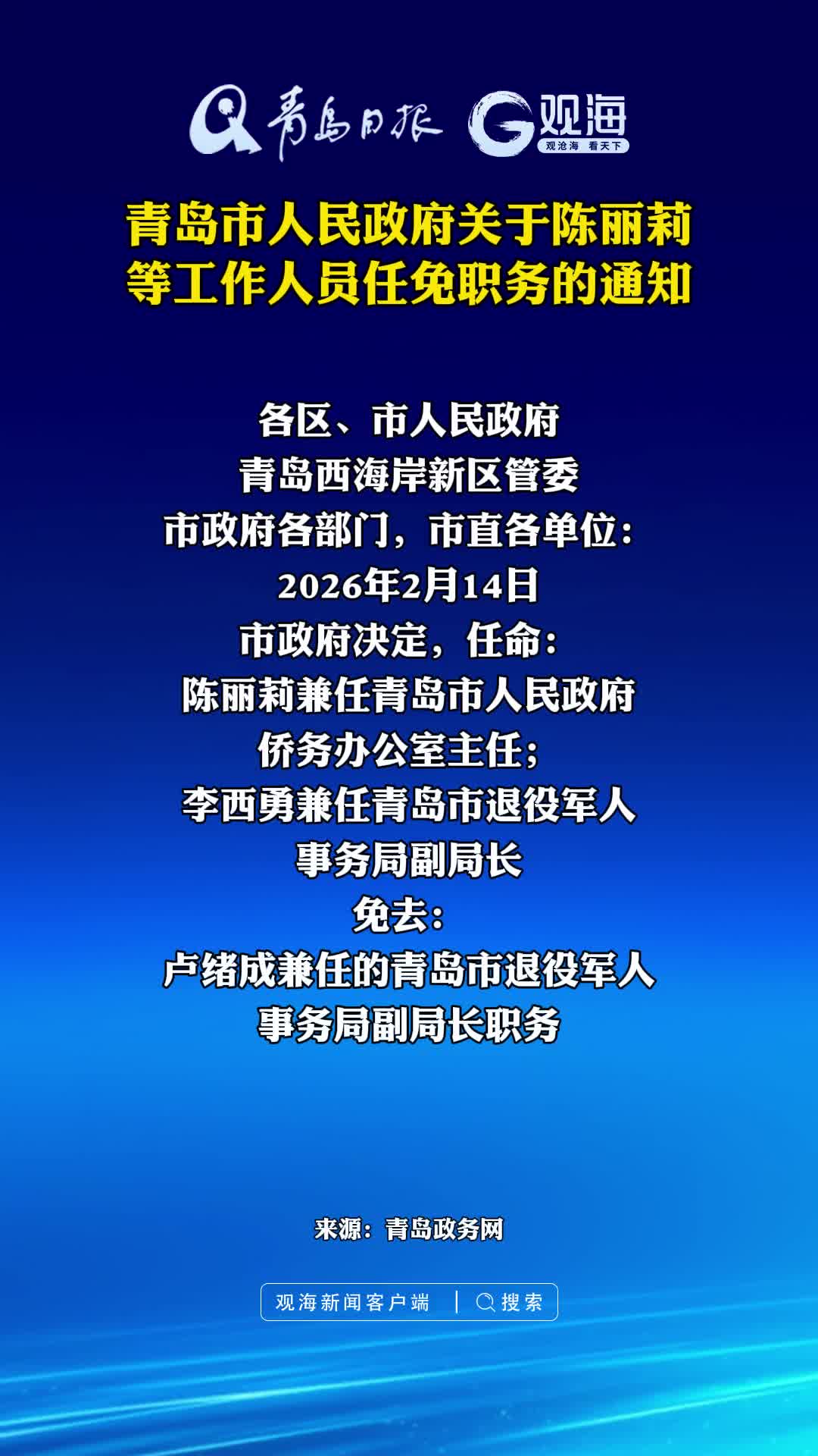 青岛市人民政府关于陈丽莉等工作人员任免职务的通知