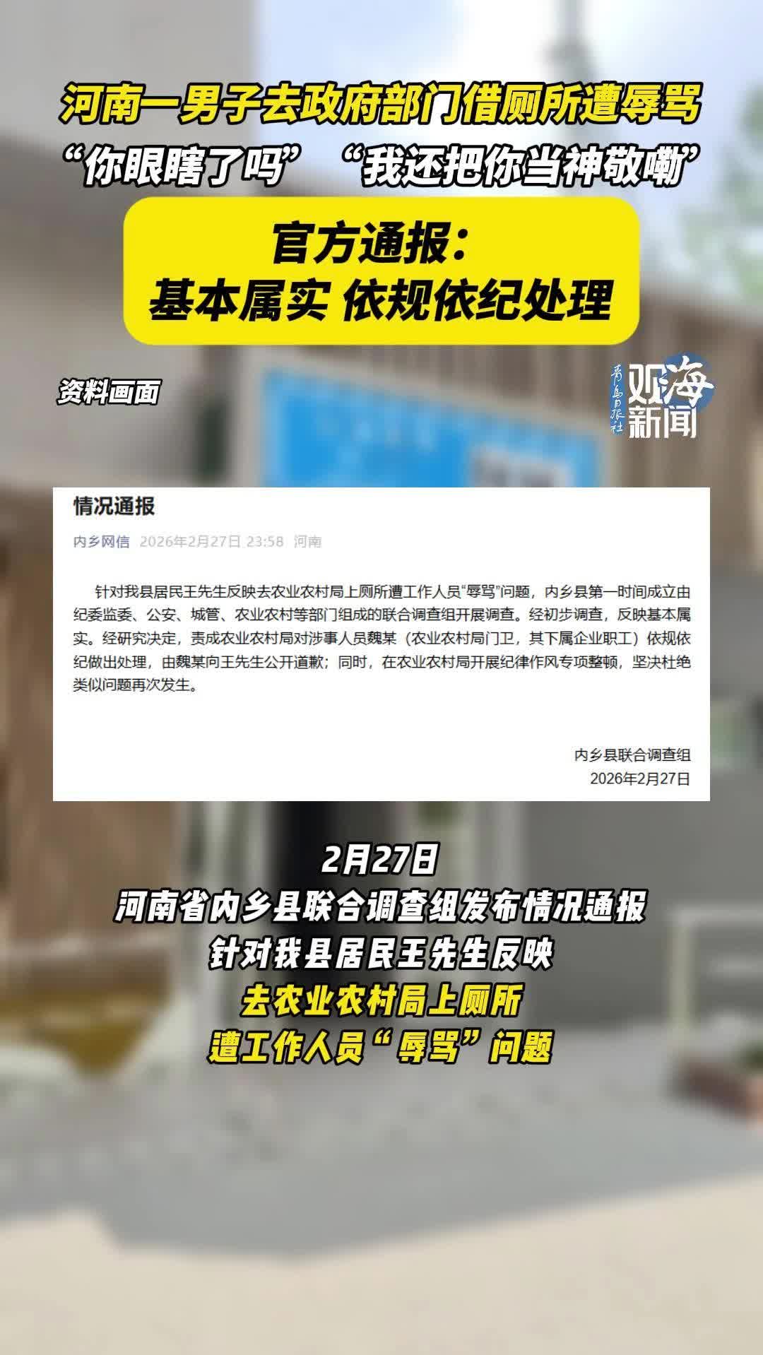 河南一男子去政府部门借厕所遭辱骂,官方通报:基本属实,依规依纪处理
