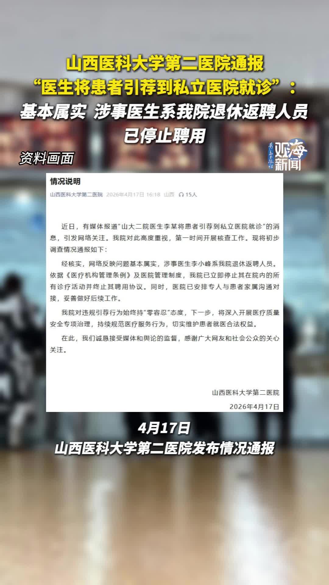 山西医科大学第二医院通报“医生将患者引荐到私立医院就诊”:基本属实,涉事医生系我院退休返聘人员,已停止聘用