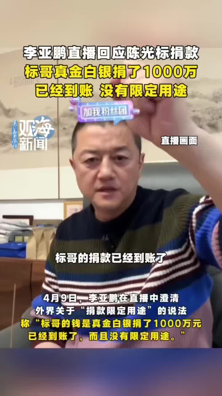 李亚鹏直播回应陈光标捐款,1000万已经到账
