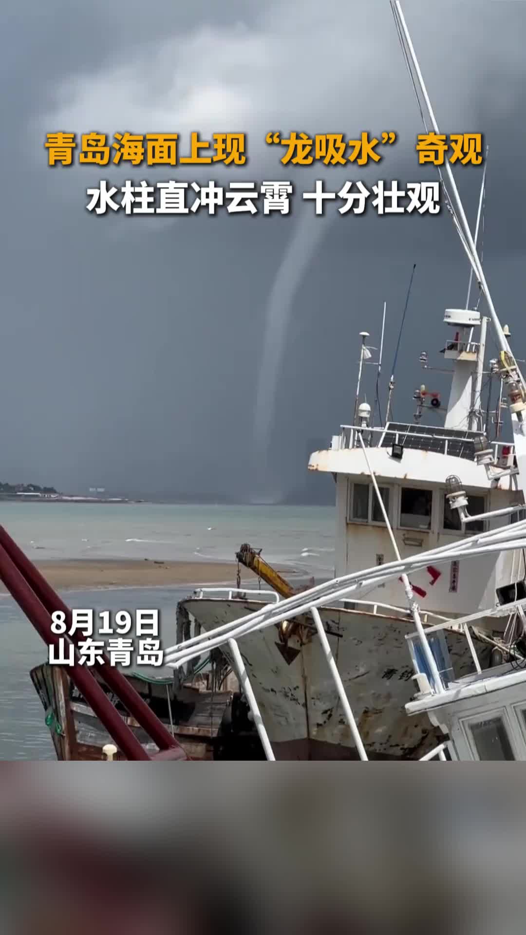 青岛海面上出现“龙吸水”奇观,水柱直冲云霄!