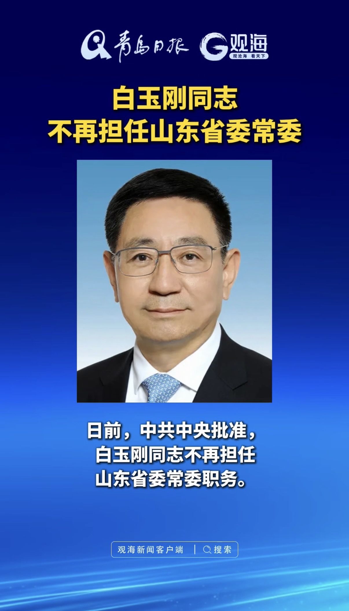 白玉刚同志不再担任山东省委常委
