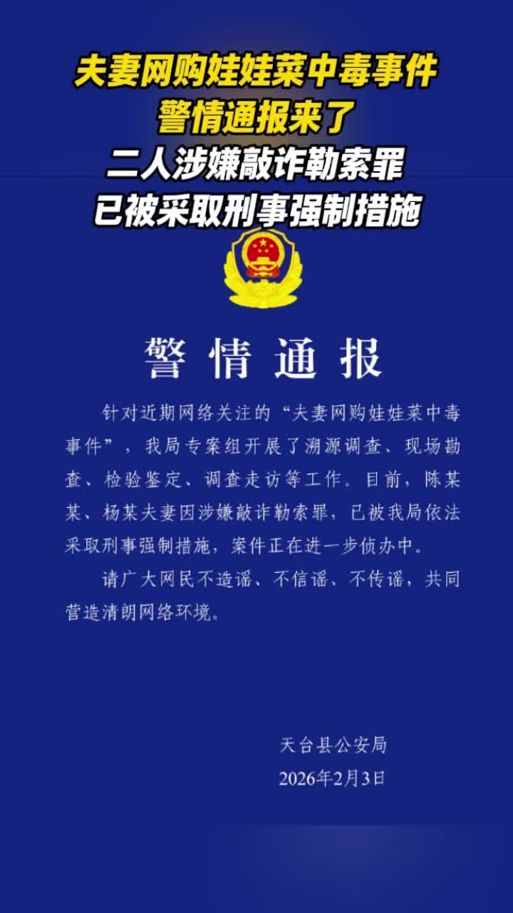 夫妻网购娃娃菜中毒事件警情通报来了,二人涉嫌敲诈勒索罪,已被采取刑事强制措施