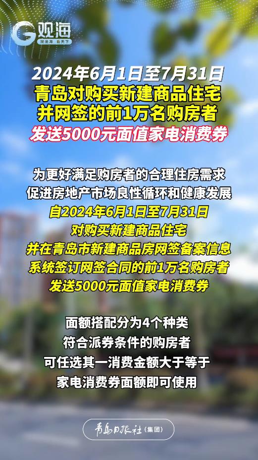 青岛对购买新房并网签的前1万名购房者发送5000元面值家电消费券