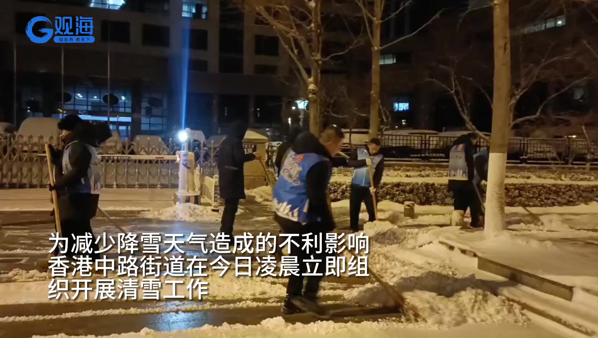 为保障出行安全和道路畅通,香港中路街道在凌晨全力清雪