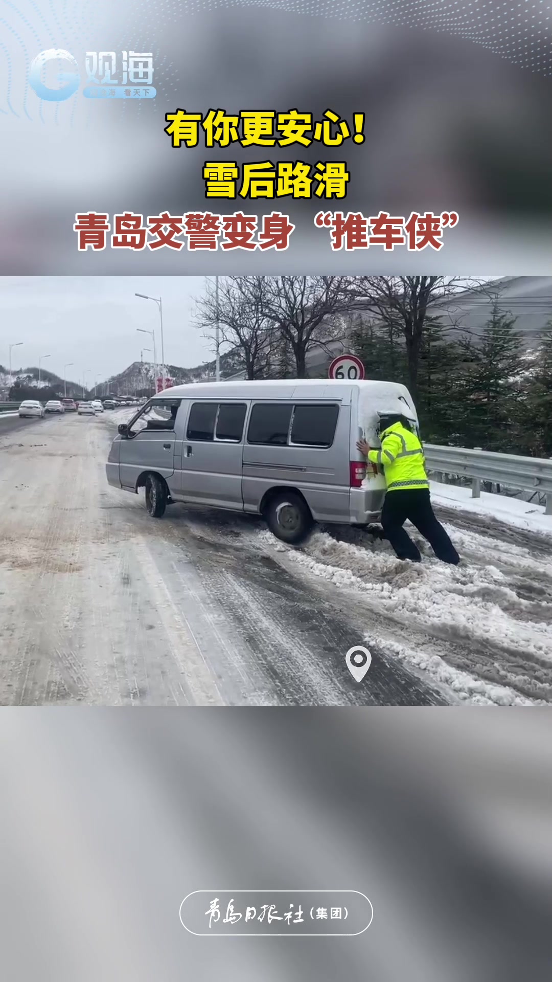 有你更安心!雪后路滑,青岛交警变身“推车侠”