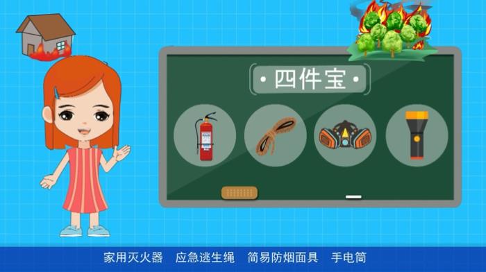 家庭应备火灾逃生四件套:家用灭火器、应急逃生绳、简易防烟面具、手电筒